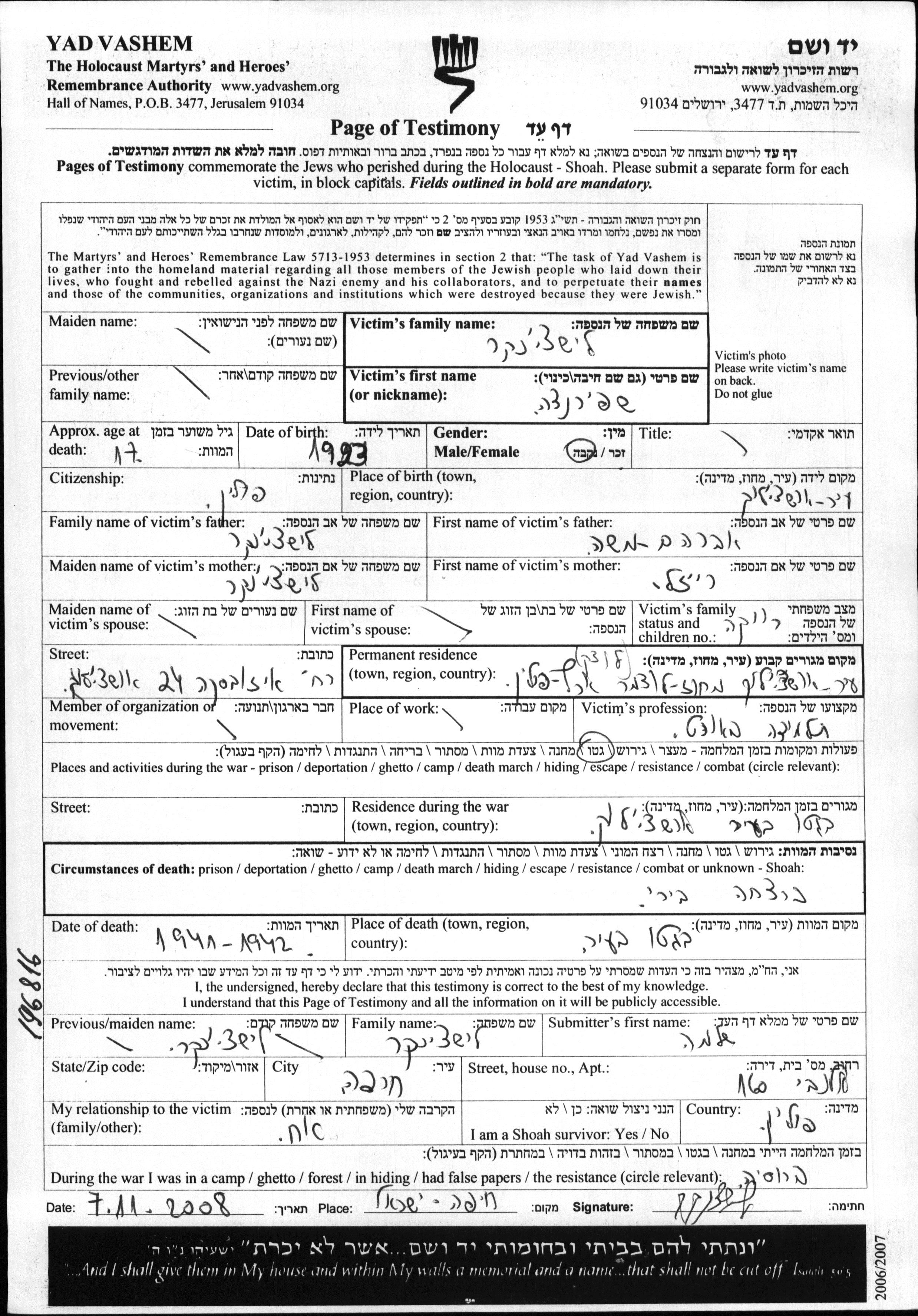 Яд Вашем - Листы свидетельских показаний Мемориального фонда