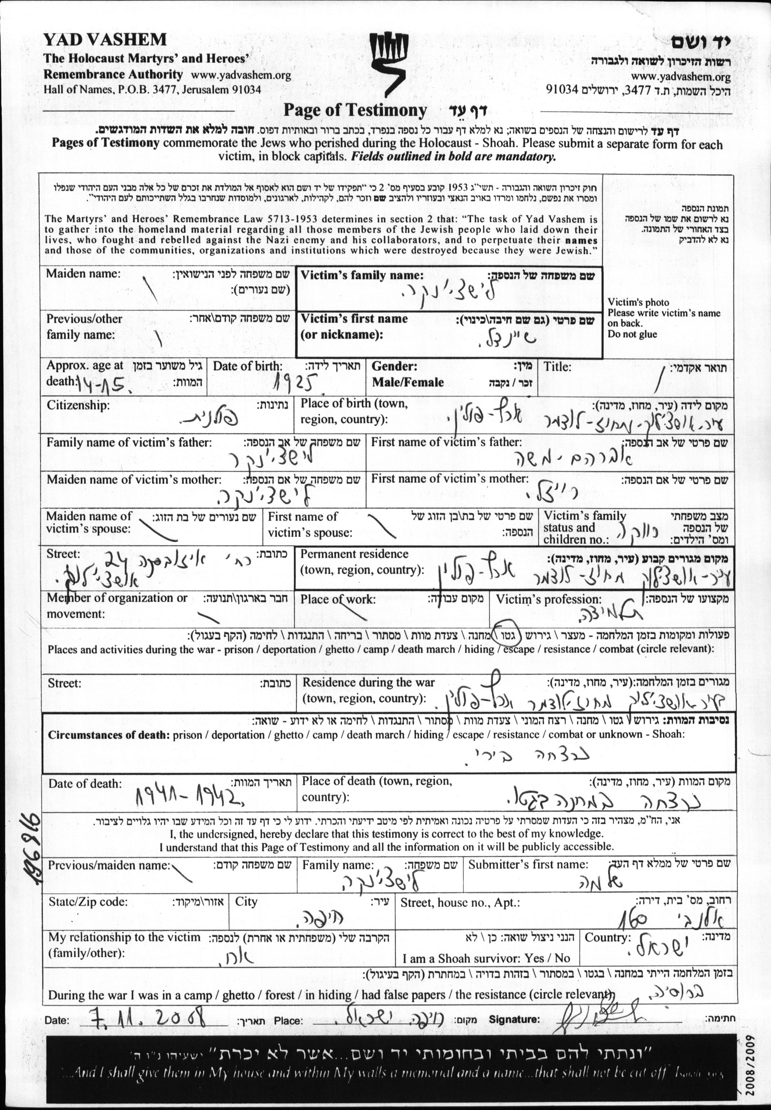 Яд Вашем - Листы свидетельских показаний Мемориального фонда