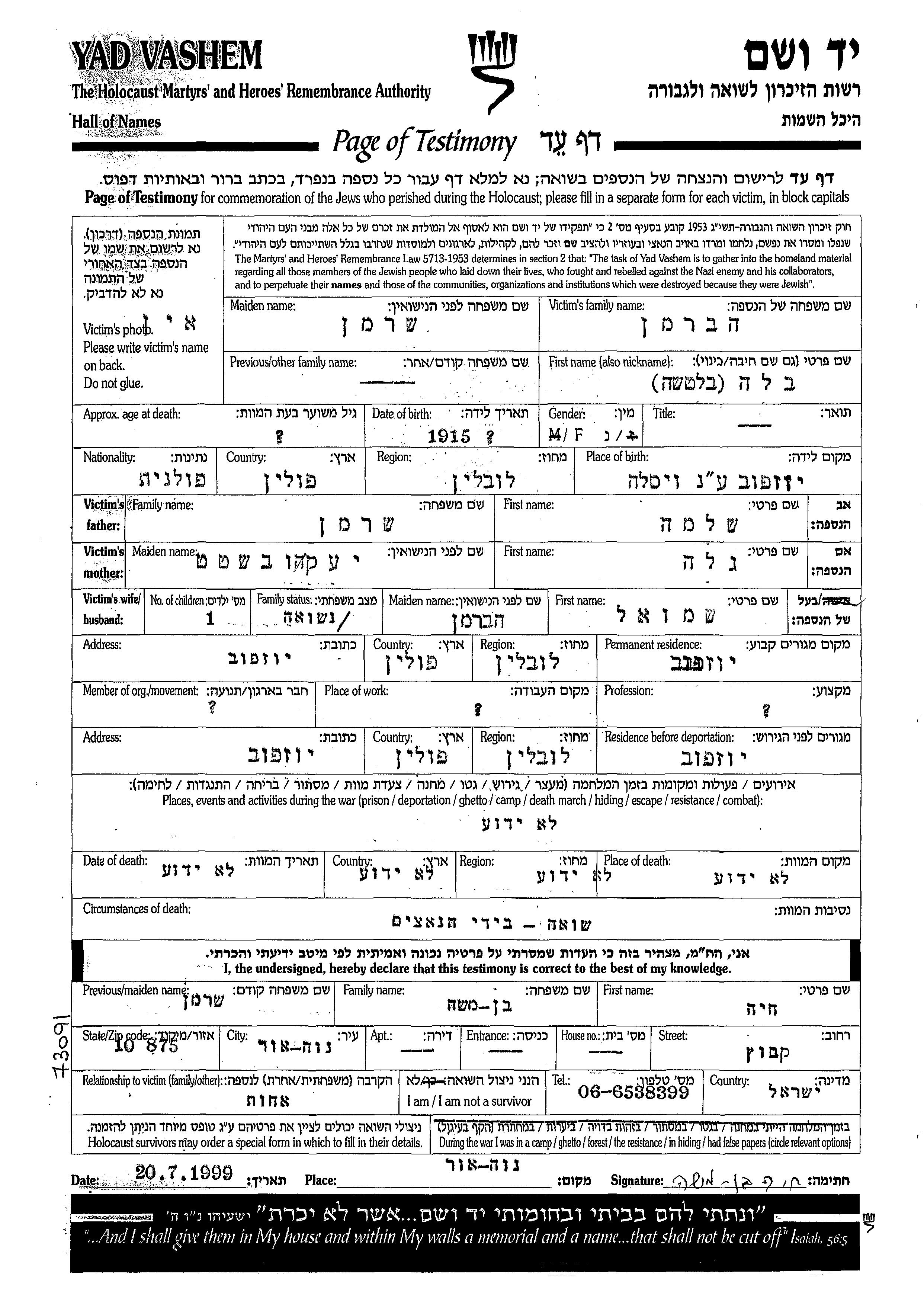 Бела Хаберман, девичья фамилия Шерман, место рождения: Юзефув, Польша. Отец: Шломо, mать:Гела. Женат / замужем. Место жительства до войны: Юзефув, Польша. Место во время войны: Юзефув, Польша.