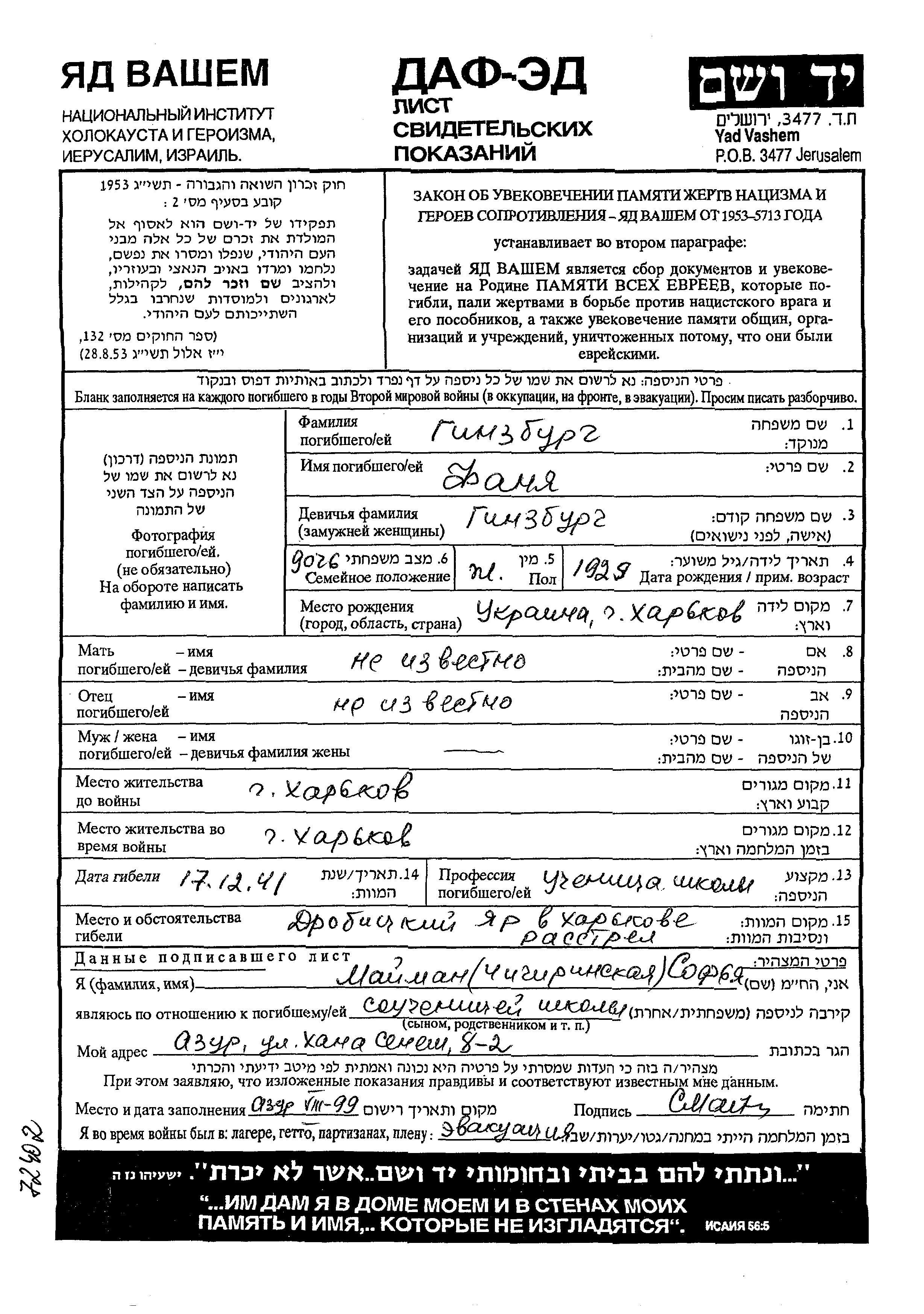 Гинзбург Фаня 1929 Харьков, Украина (СССР) Лист свидетельских показаний