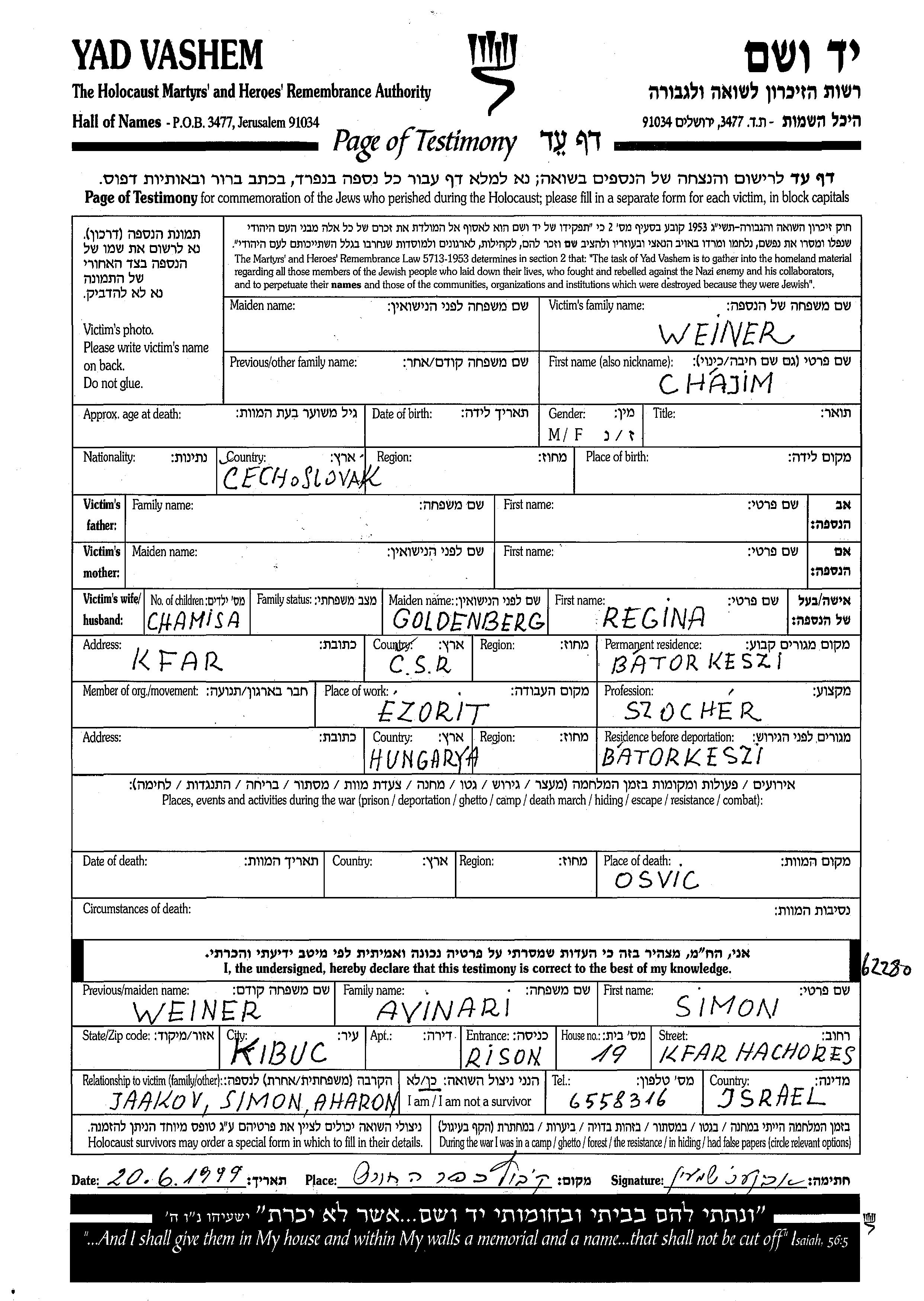 Вейнер Хаим Баторкеси, Чехословакия Лист свидетельских показаний