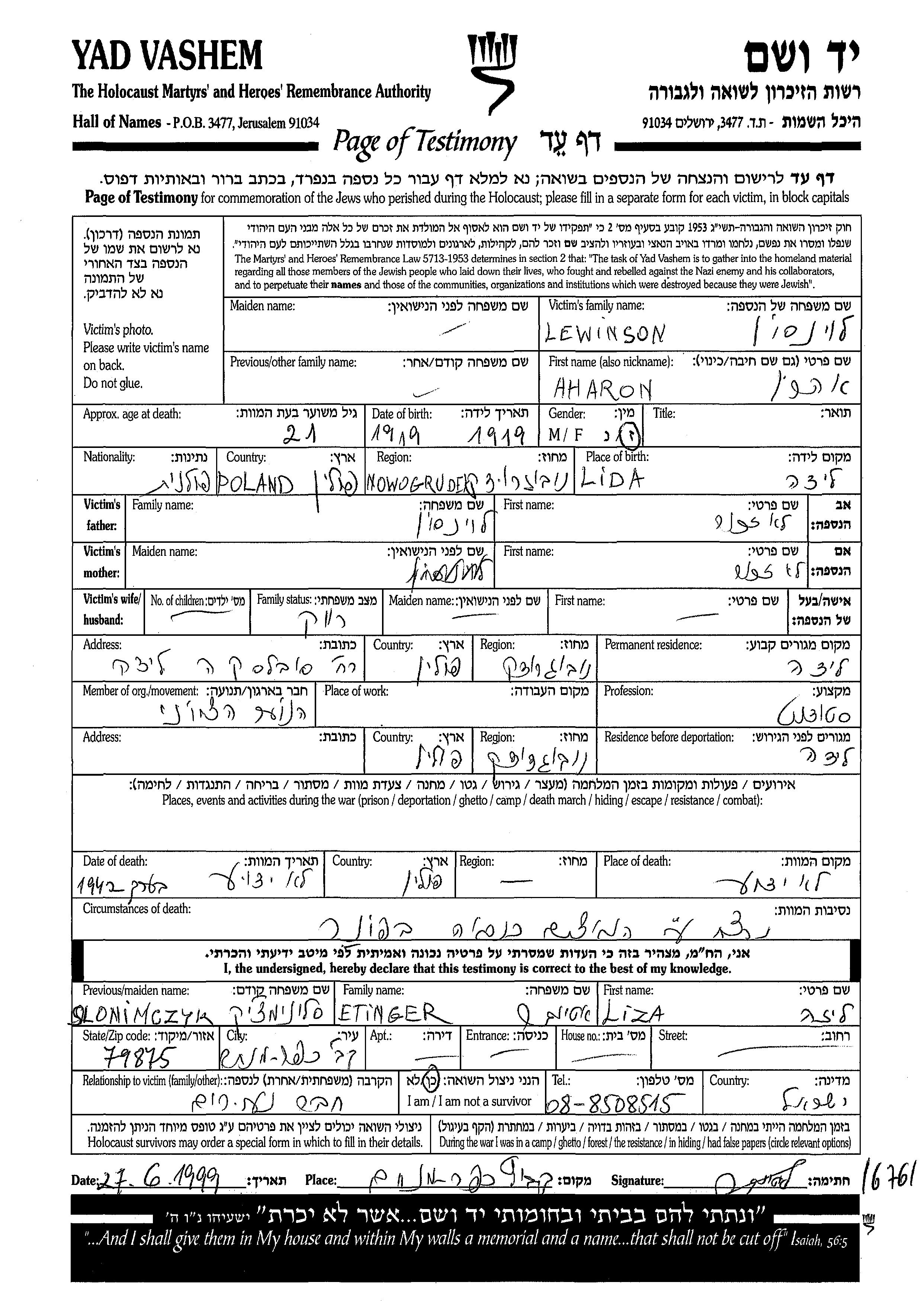 Левинсон Арон 1919 Лида, Польша Лист свидетельских показаний