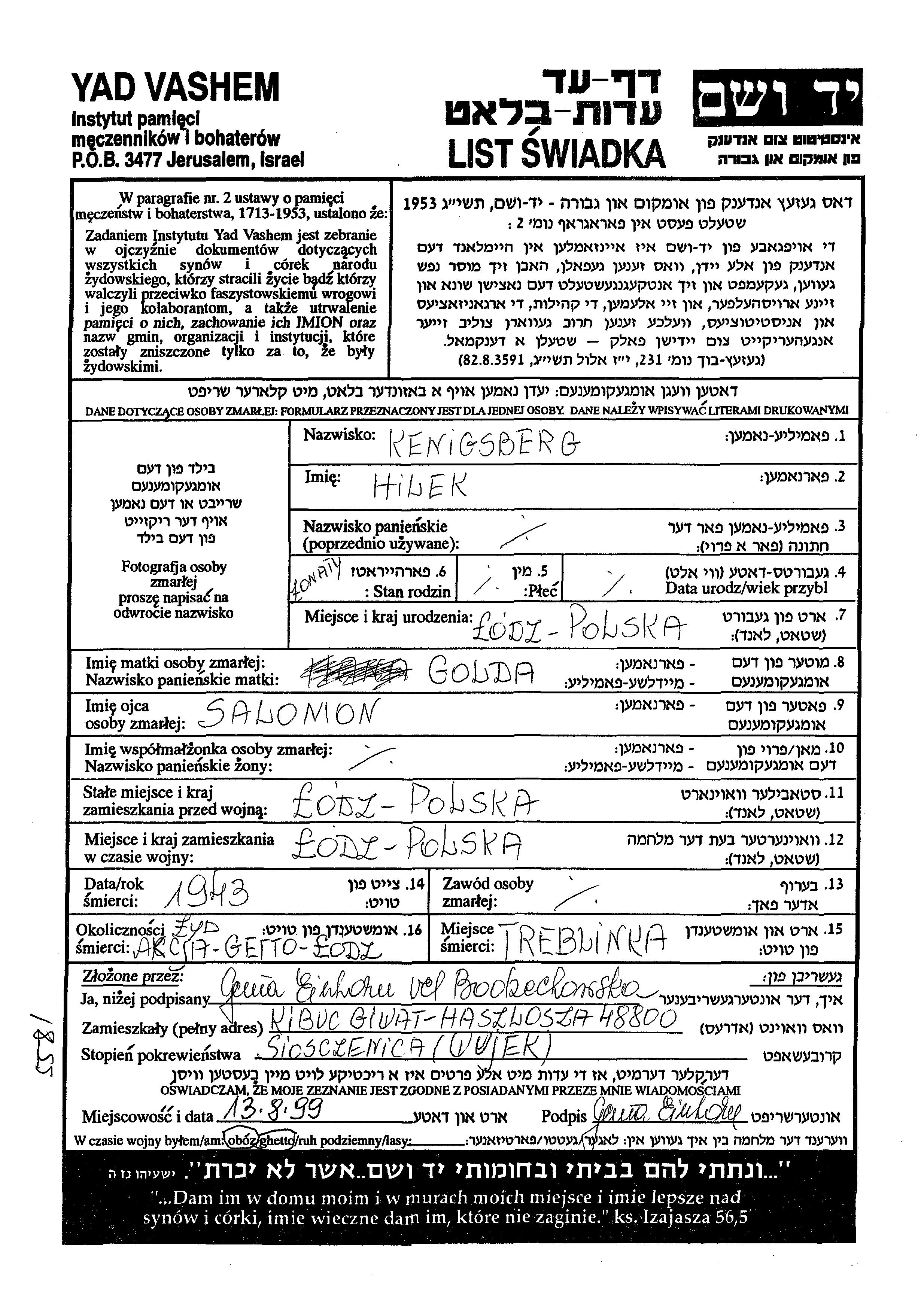 Хилек Кенигсберг, место рождения: Лодзь, Польша. Отец: Саломон, mать:Голда. Женат / замужем. Место жительства до войны: Лодзь, Польша. Место во время войны: Лодзь, Польша.