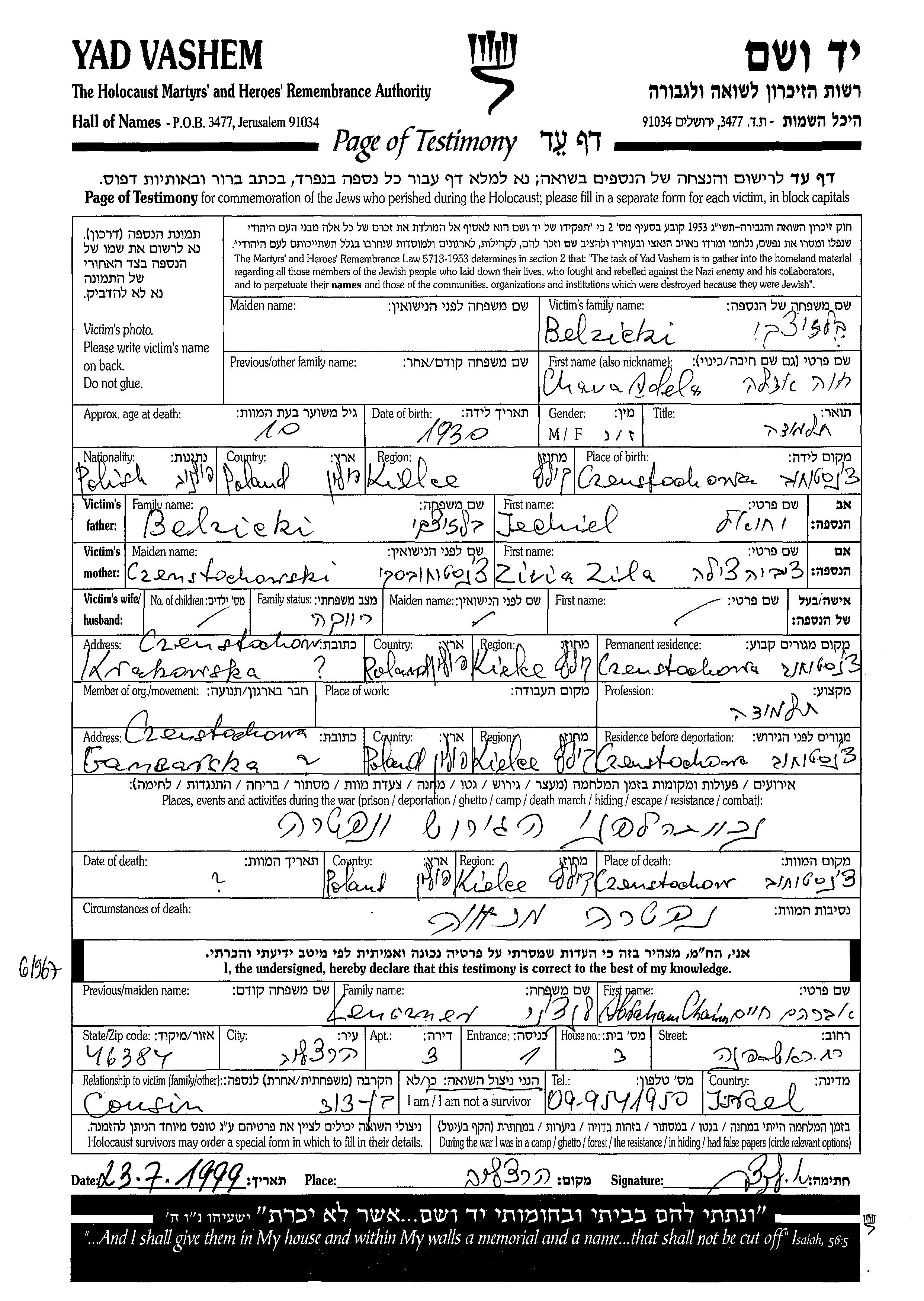 Белзицки Хава Адела 1930 Ченстохов, Польша Лист свидетельских показаний