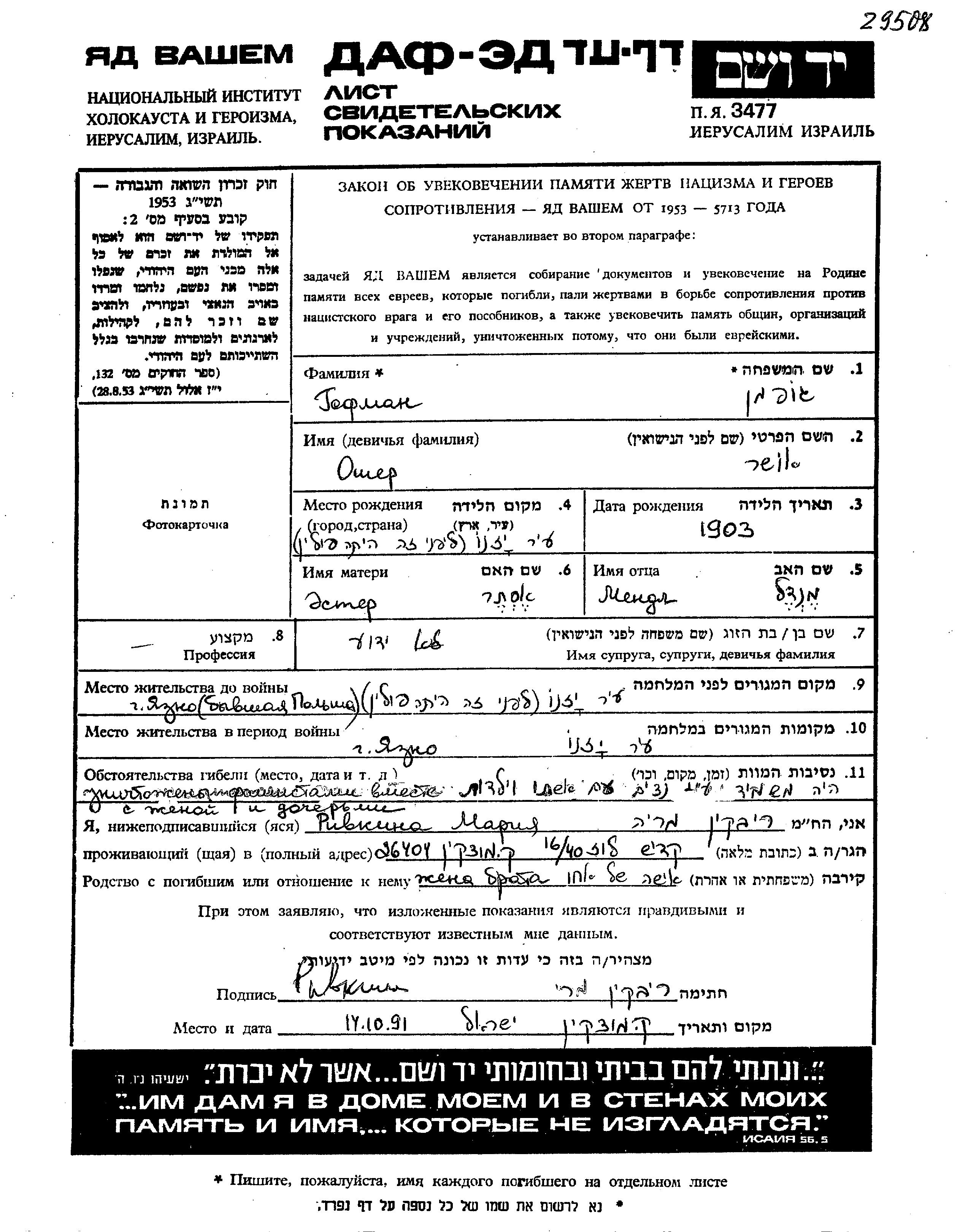 Гофман Ошер 1903 Язно, Польша Лист свидетельских показаний