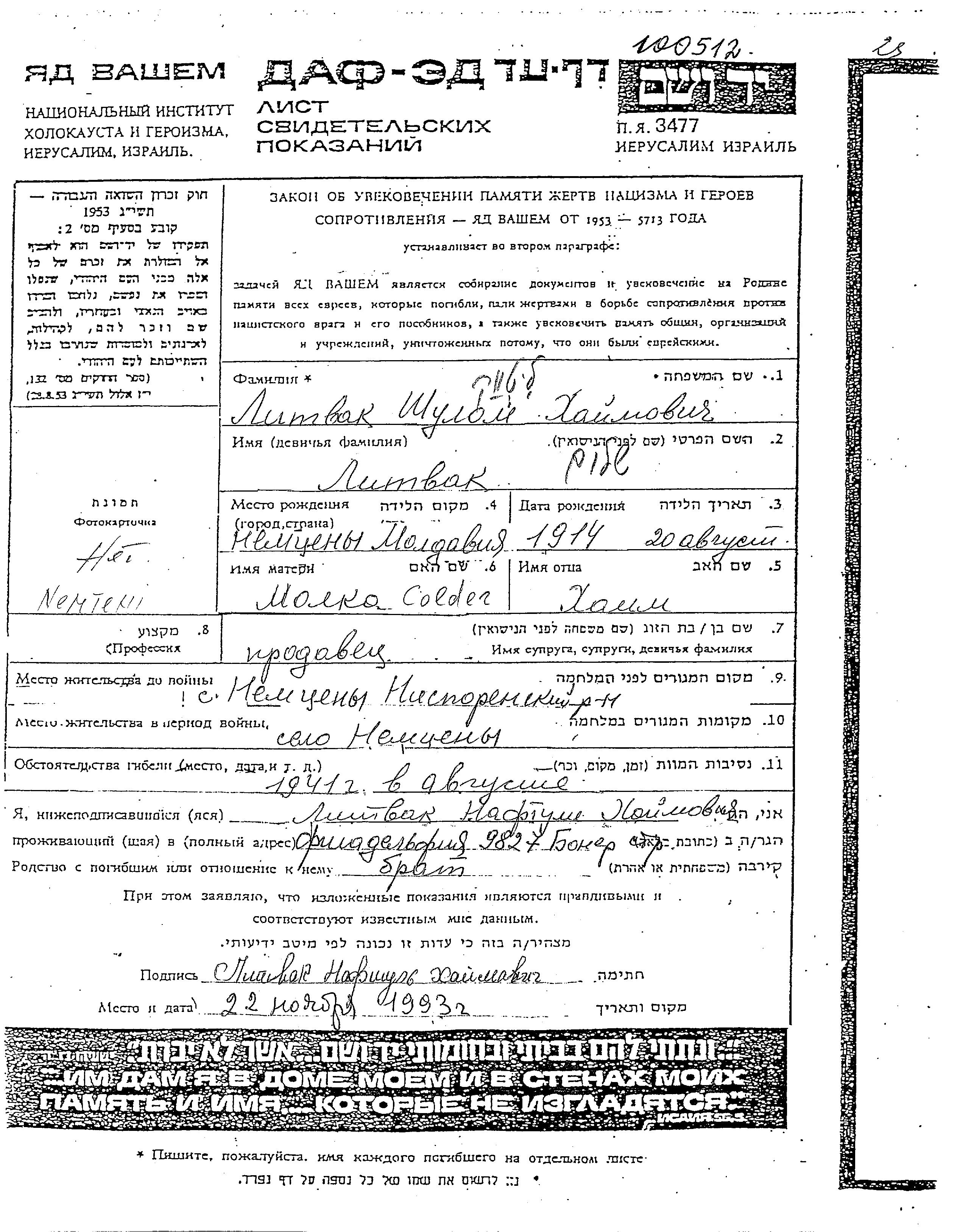 Литвак | Шулом | 1914 | Немцень, Румыния | Лист свидетельских показаний |