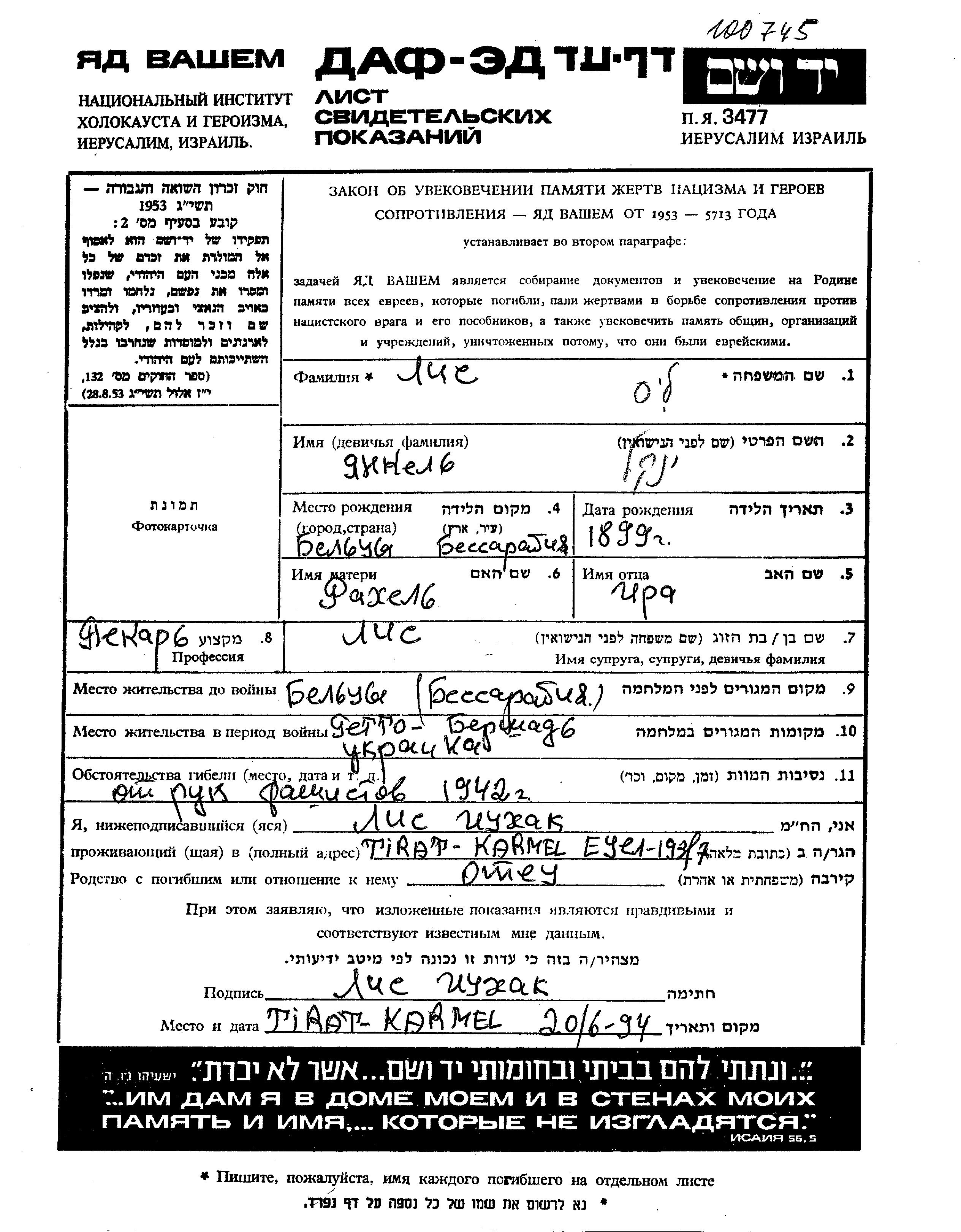 Лис Янкель 1899 Бельцы, Румыния Лист свидетельских показаний