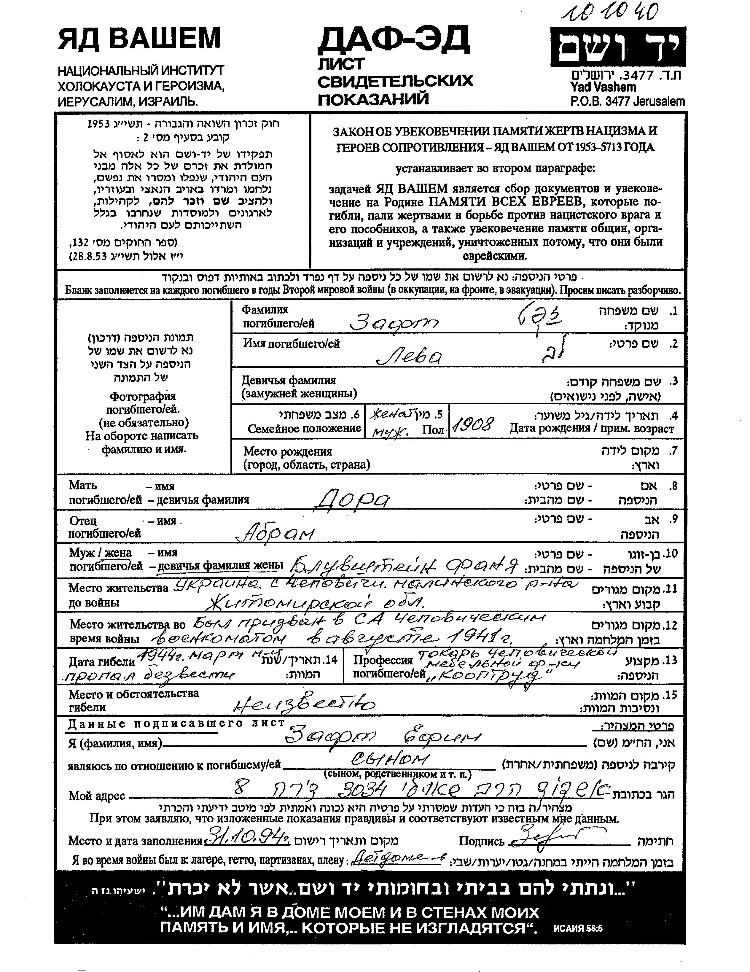 Зафт Лёва 1908 Чаповичи, Украина (СССР) Лист свидетельских показаний