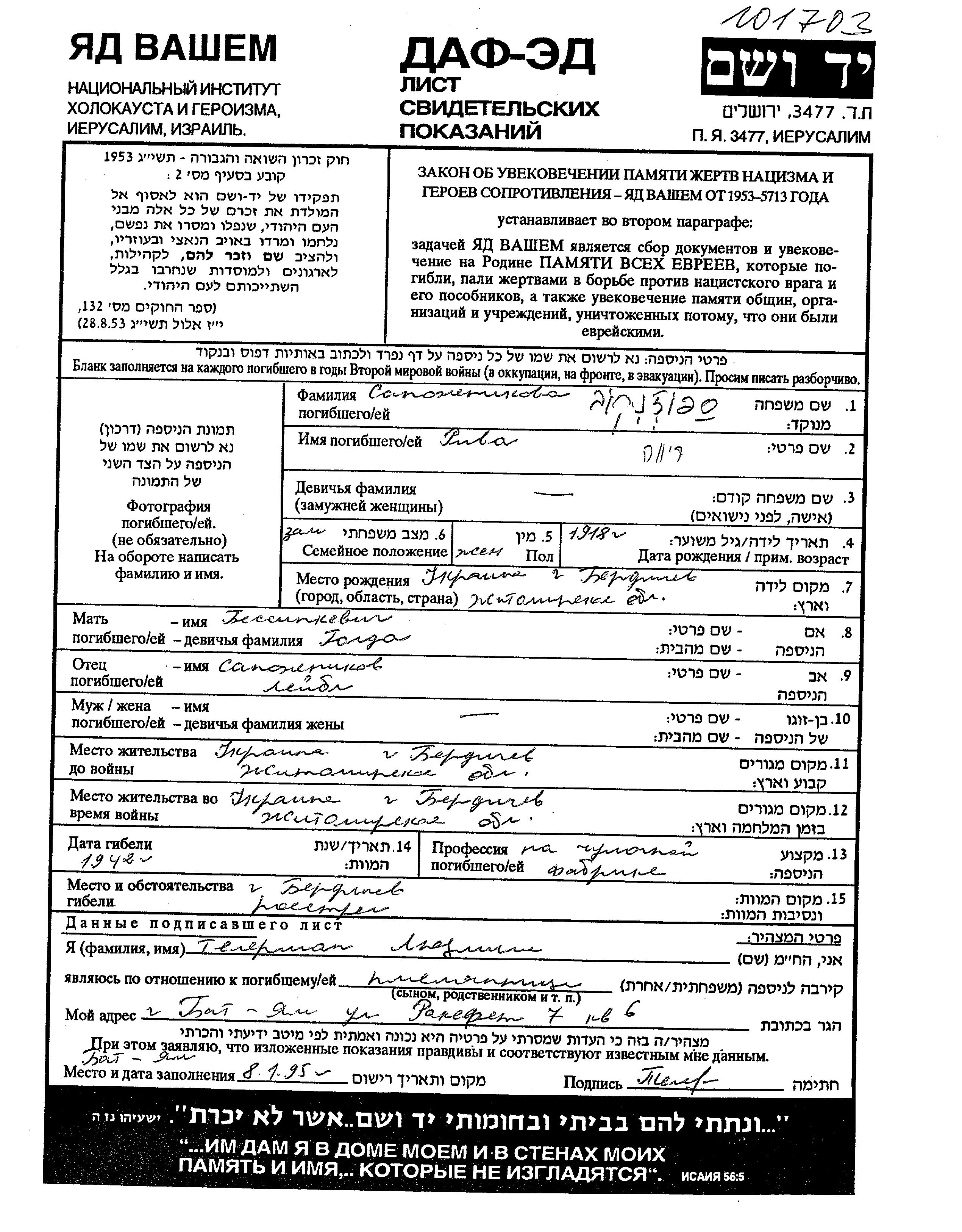 Яд Вашем - Листы свидетельских показаний Мемориального фонда