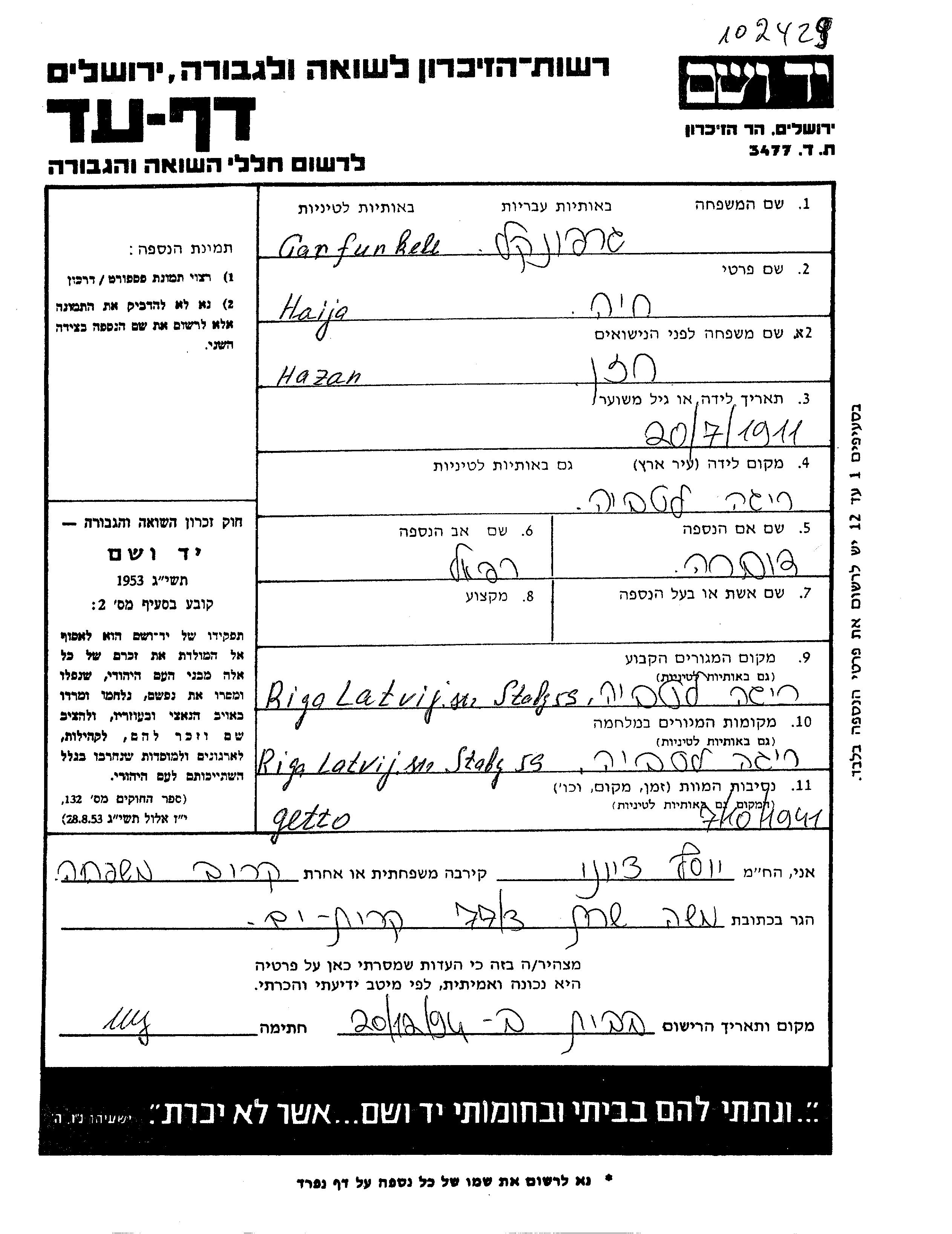 Хая Гарфункель, девичья фамилия Хазан, место рождения: Рига, Латвия. Отец: Рафаэль, mать:Добра. Женат / замужем. Место жительства до войны: Рига, Латвия. Место во время войны: Рига, Латвия.