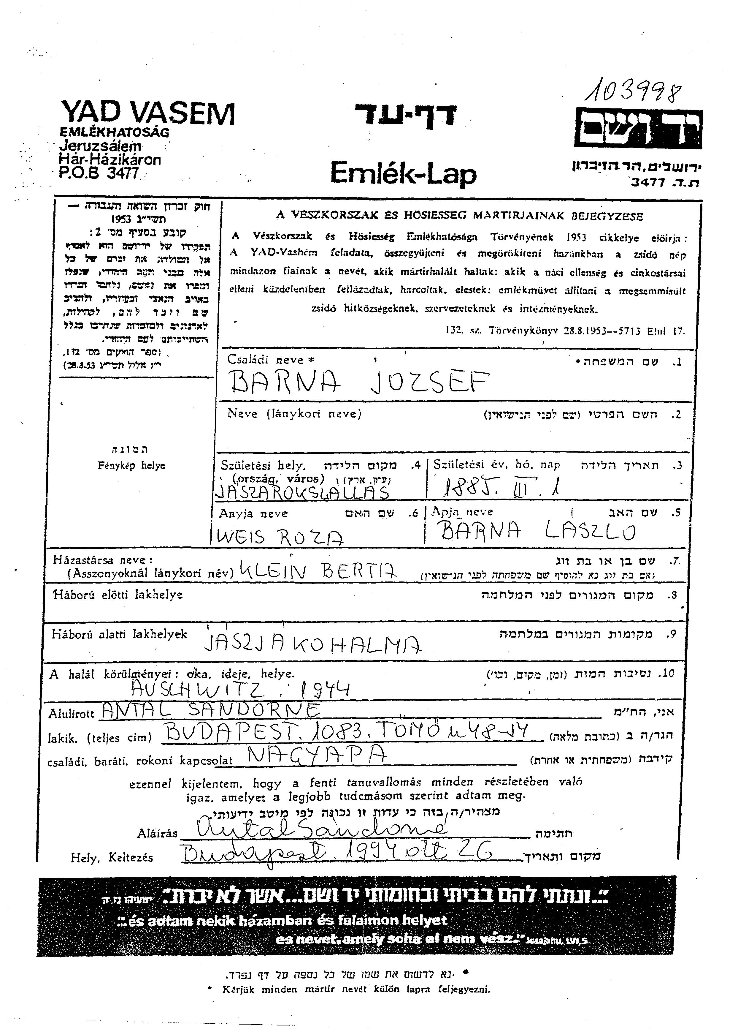 Йозеф Барна, место рождения: Ясароксаллаш, Венгрия. Отец: Ласло, mать:Роза, девичья фамилия Вейс. Женат / замужем. Место жительства до войны: Ясьякохальма, Венгрия. Место во время войны: Ясьякохальма, Венгрия.