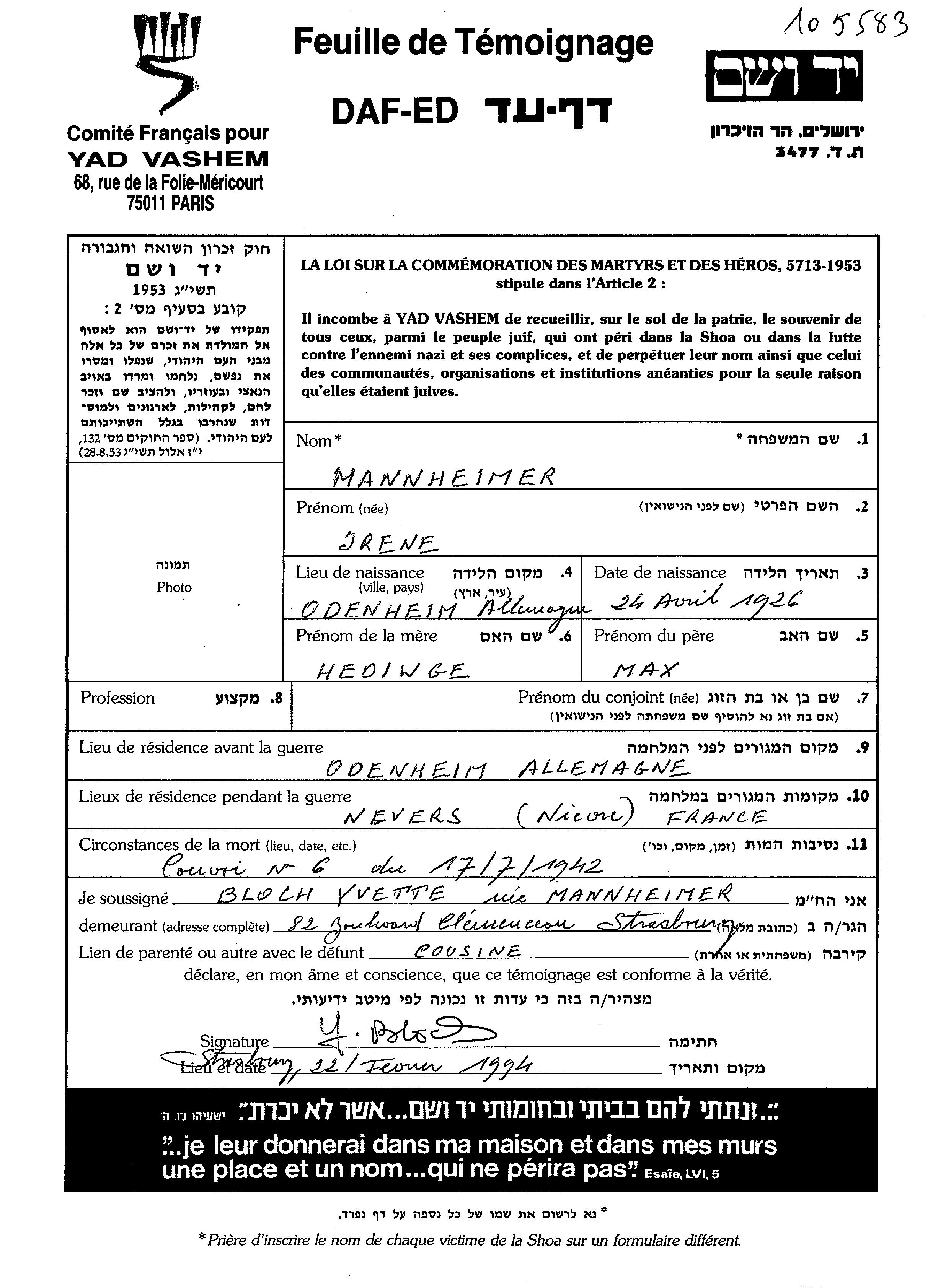Ирене Маннхаймер, место рождения: Оденхейм, Германия. Отец: Макс, mать:Хедвиг. Ребенок. Место жительства до войны: Оденхейм, Германия. Место во время войны: Невер, Франция.