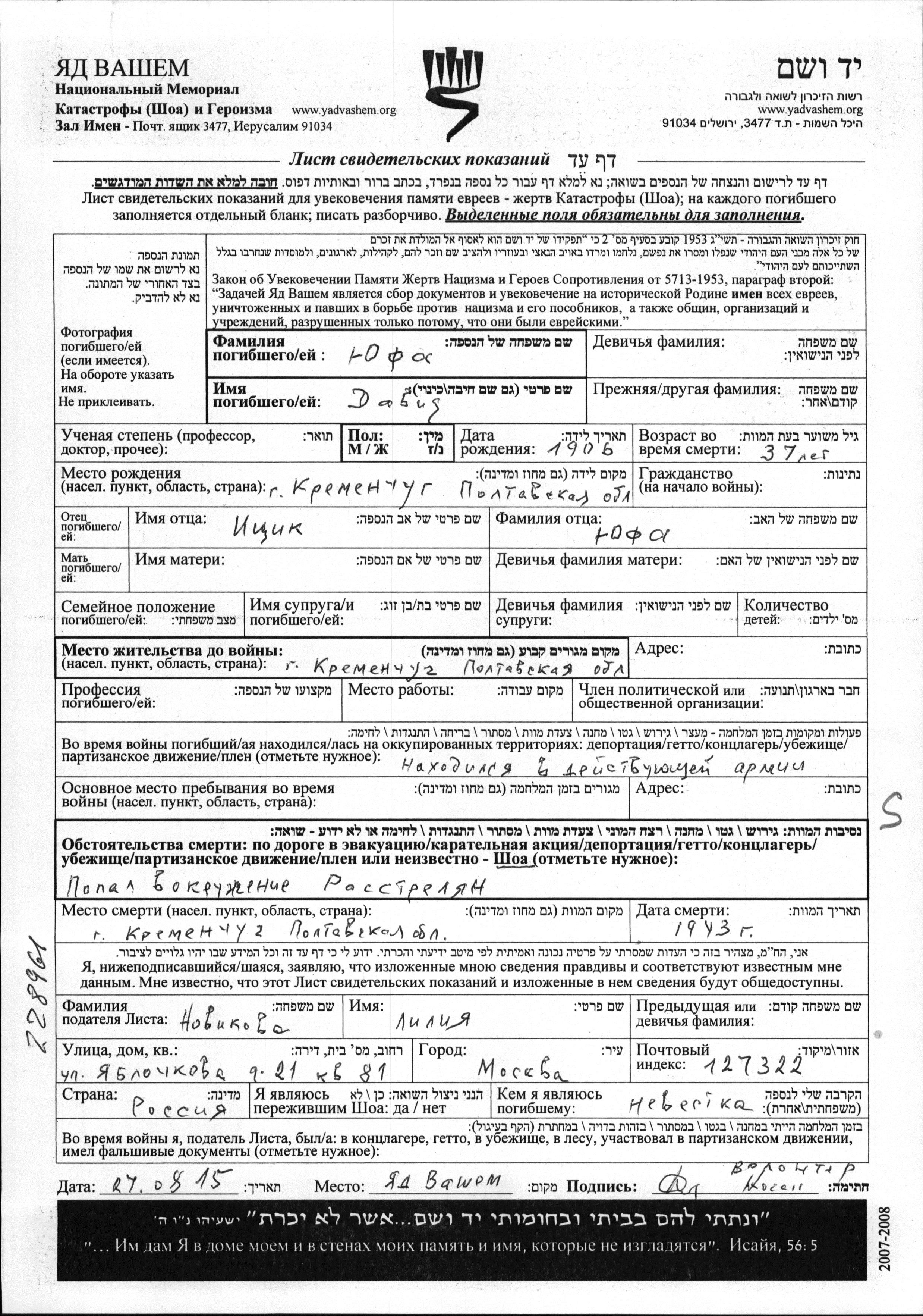 Юфа Давид 1906 Кременчуг, Украина (СССР) Лист свидетельских показаний