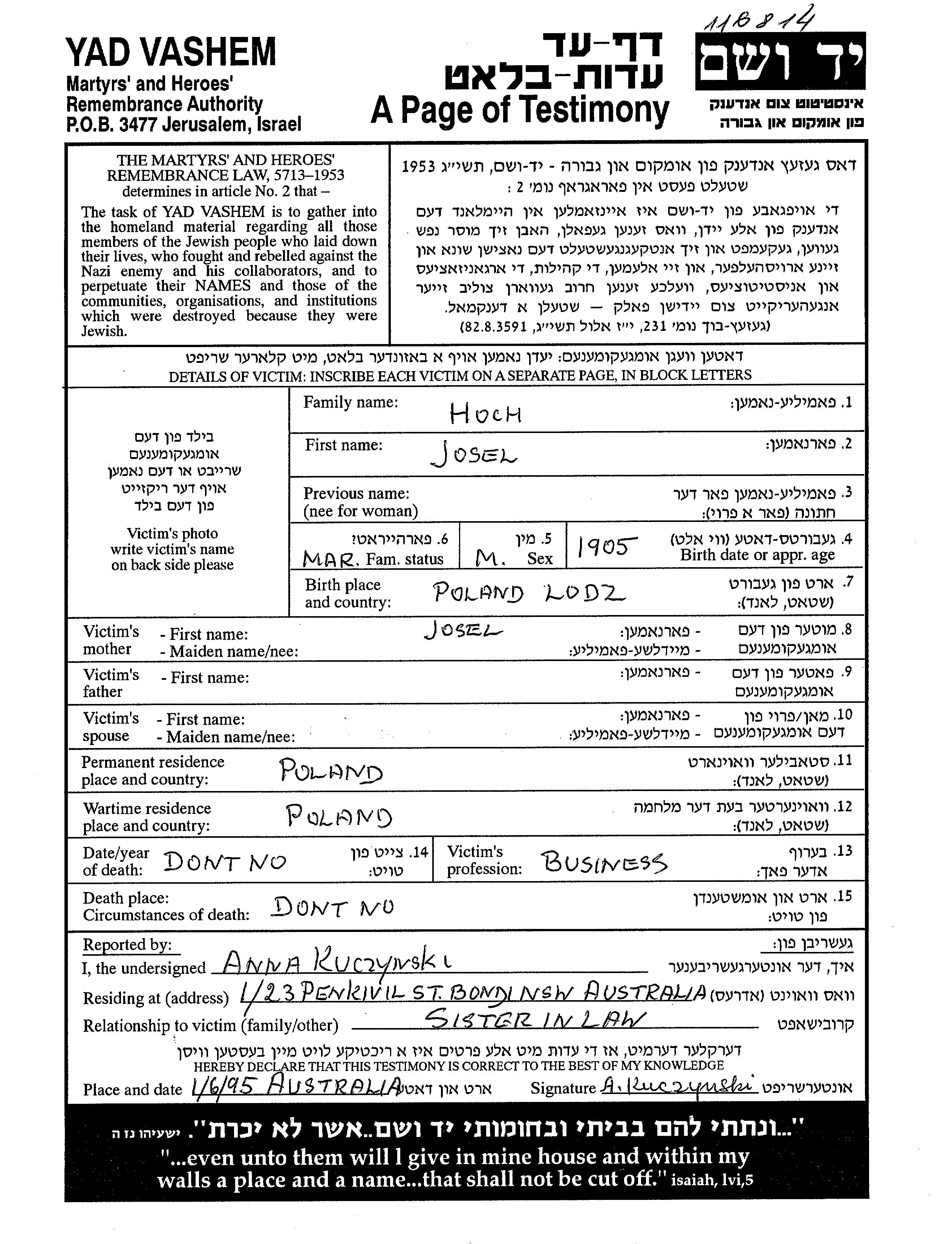 Йосел Хох, место рождения: Лодзь, Польша. Предприниматель. Женат / замужем. Место жительства до войны: Польша. Место во время войны: Польша.