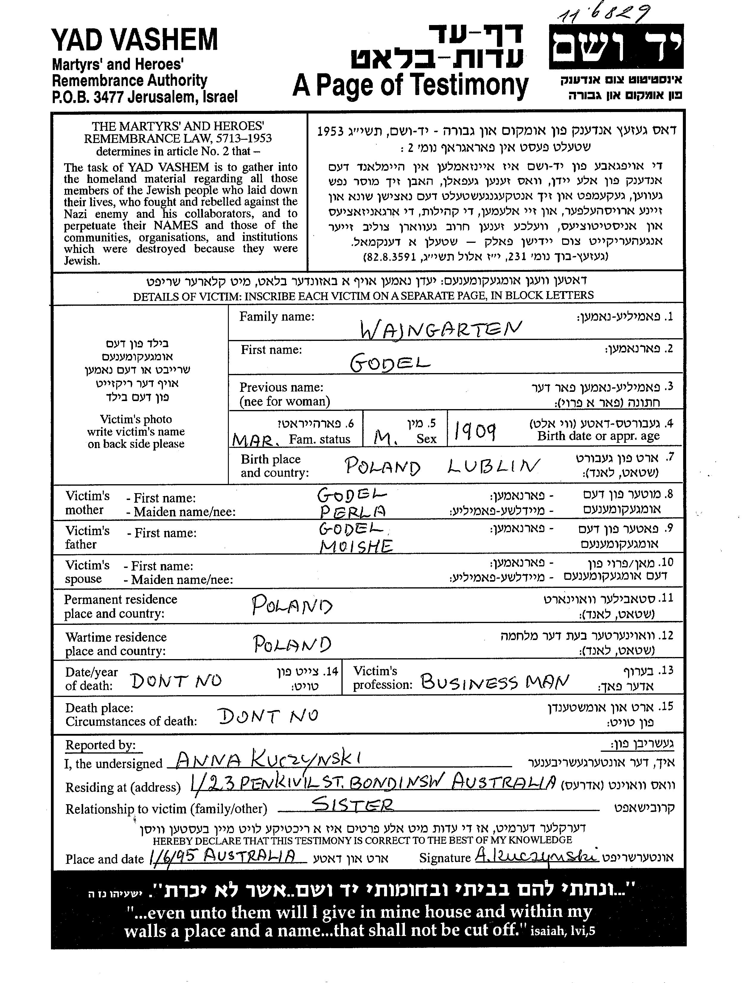 Годель Вайнгартен, место рождения: Люблин, Польша. Отец: Мойше, mать:Перла, девичья фамилия Лейзман Лейцман. Предприниматель. Женат / замужем. Место жительства до войны: Польша. Место во время войны: Польша.