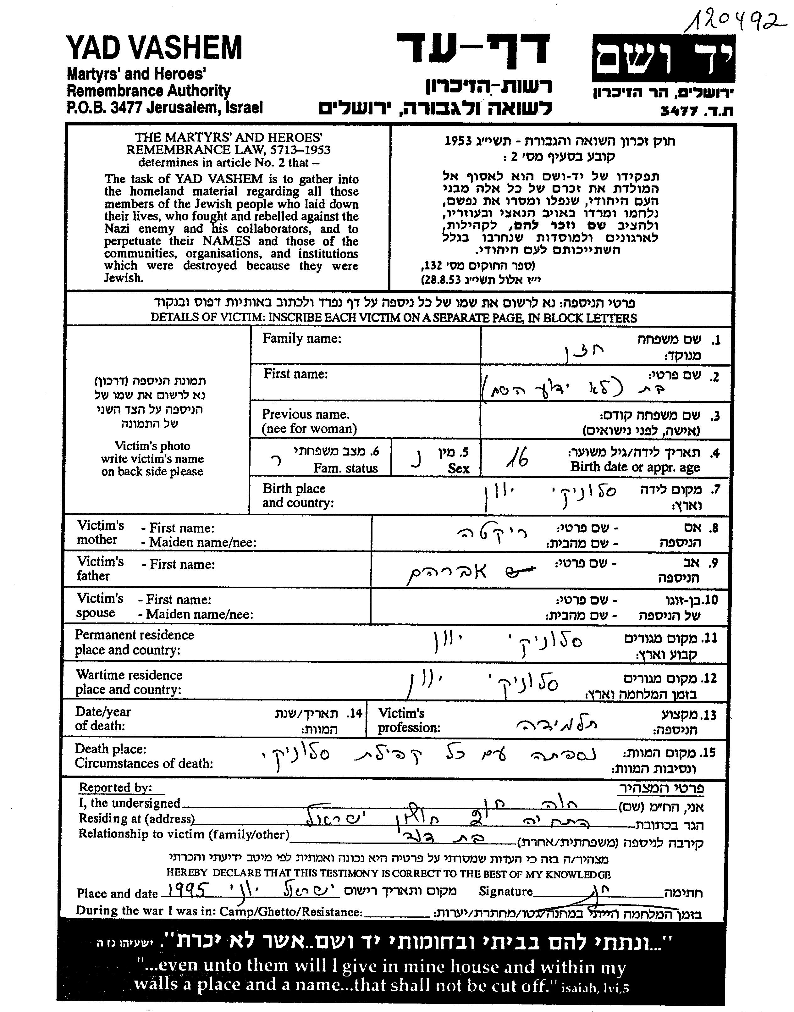 Яд Вашем - Листы свидетельских показаний Мемориального фонда