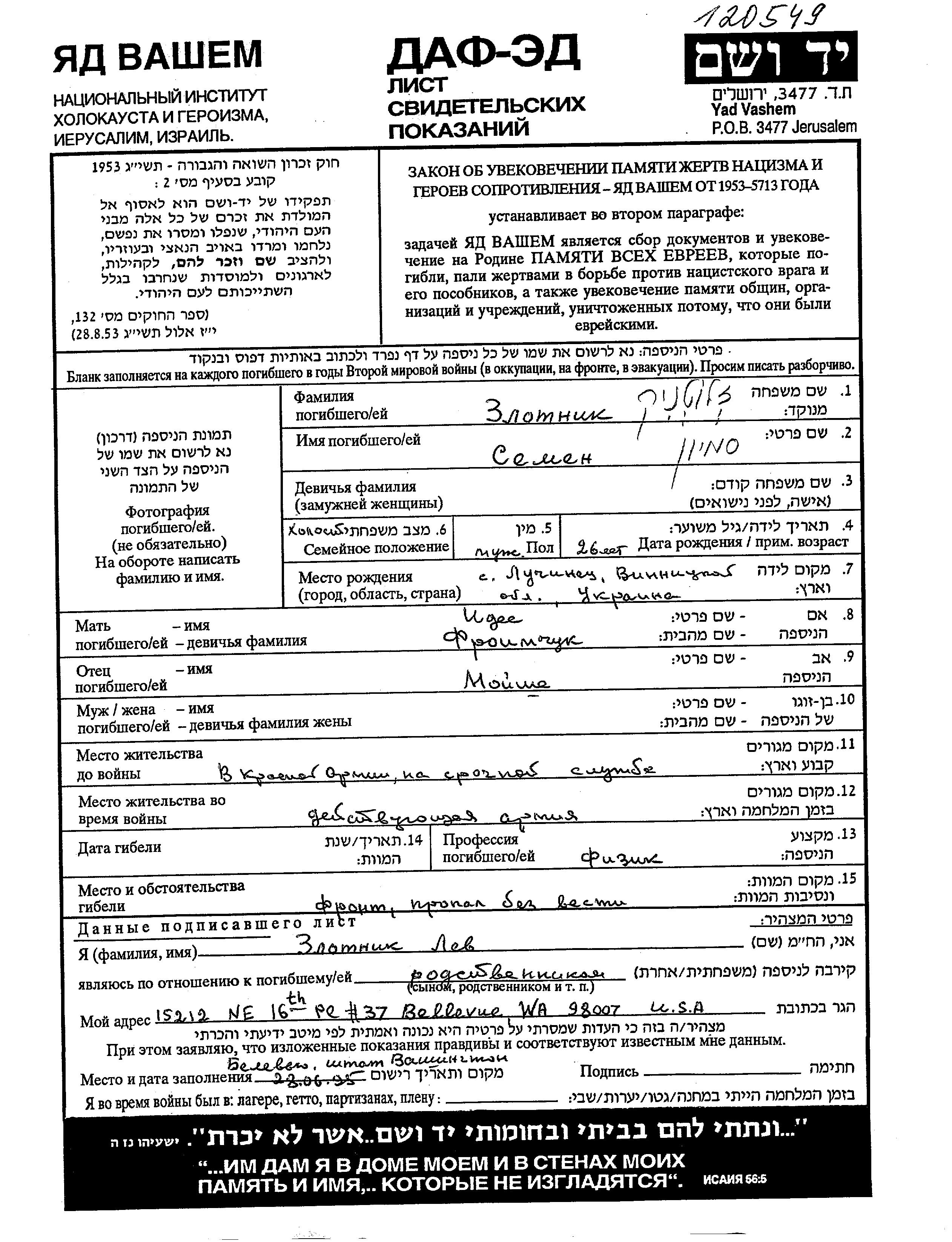 Яд Вашем - Листы свидетельских показаний Мемориального фонда