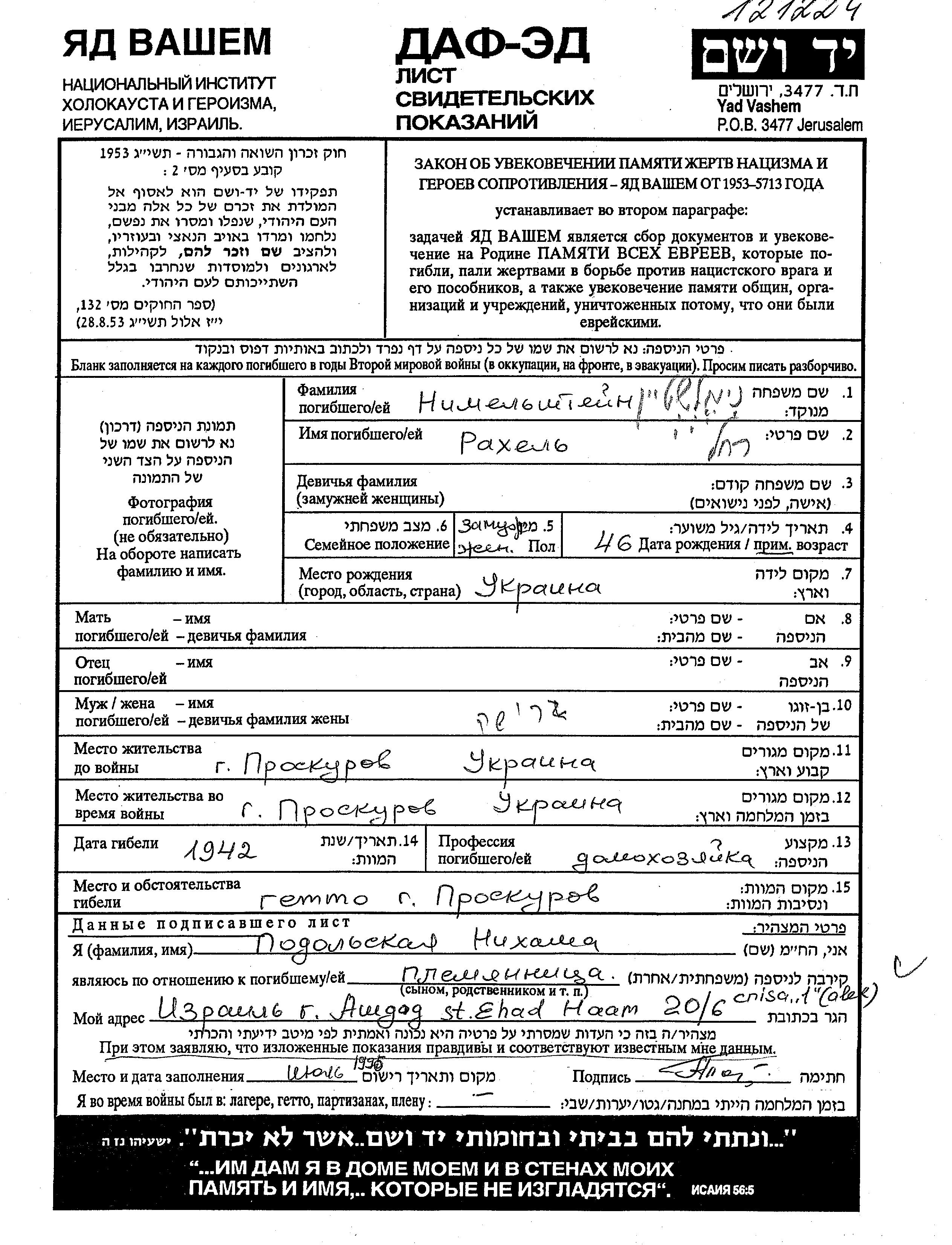 Нимельштейн Рахель 1896 Проскуров, Украина (СССР) Лист свидетельских показаний