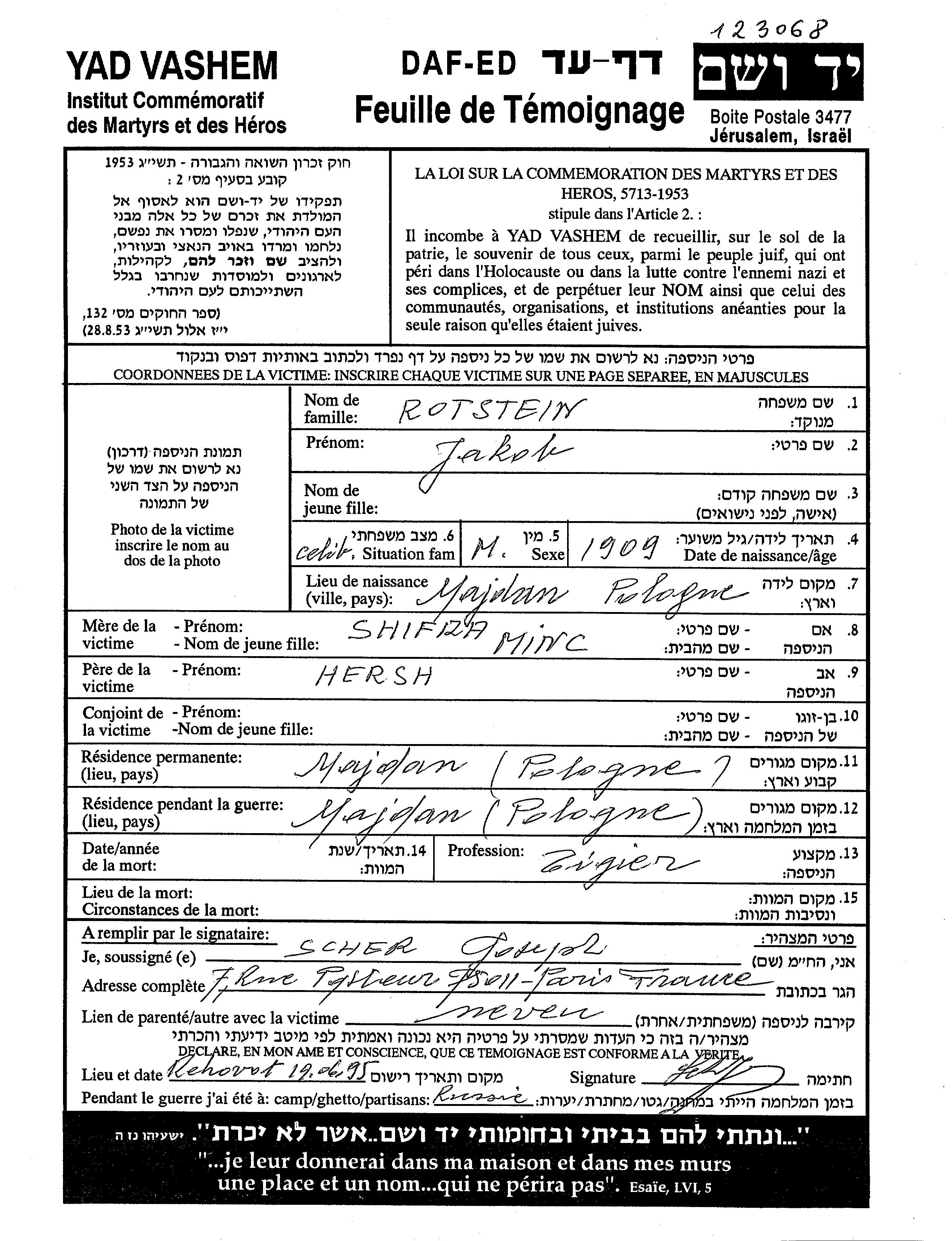 Якоб Ротштайн, место рождения: Майдан, Польша. Отец: Герш, mать:Шифра, девичья фамилия Минц. Рабочий / рабочая. Холост / не замужем. Место жительства до войны: Майдан, Польша. Место во время войны: Майдан, Польша.