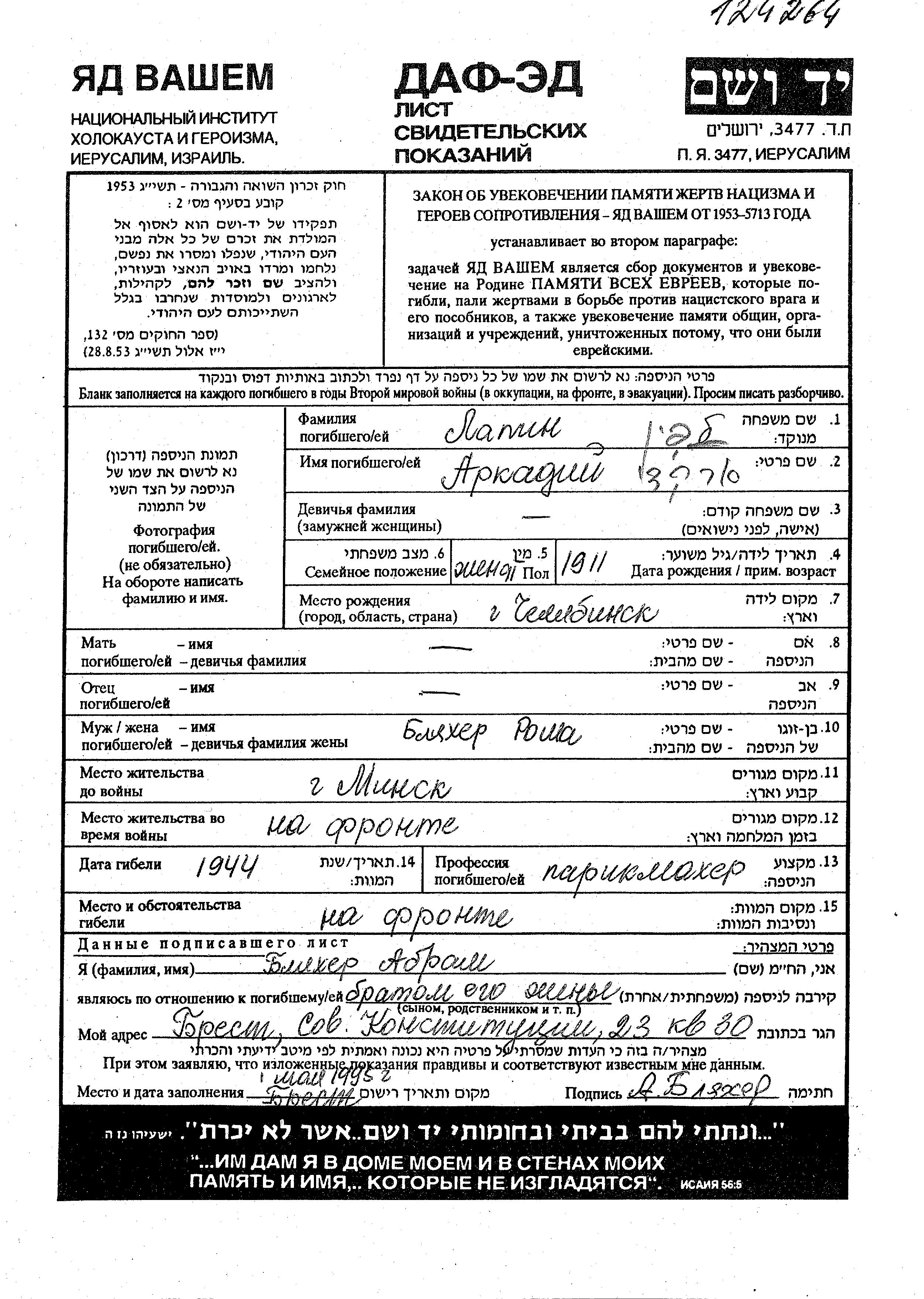Аркадий Лапин, место рождения: Челябинск, Россия (СССР). Парикмахер. Женат / замужем. Место жительства до войны: Минск, Белоруссия (СССР). Место во время войны: Вооруженные силы Советского Союза. Аркадий погиб на военной службе. место смерти: неизвестно в 1944.
