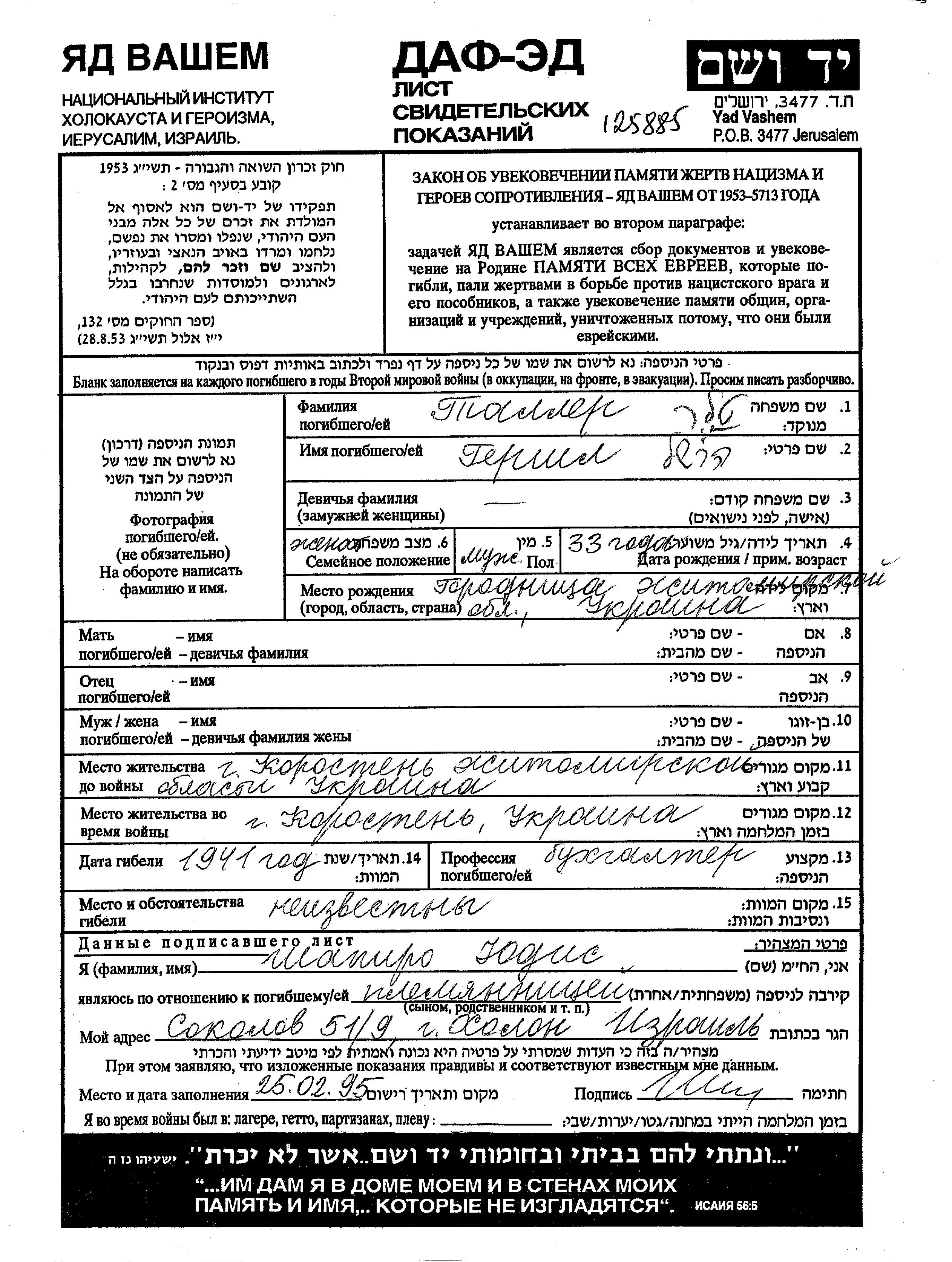 Талер Гершл 1908 Коростень, Украина (СССР) Лист свидетельских показаний