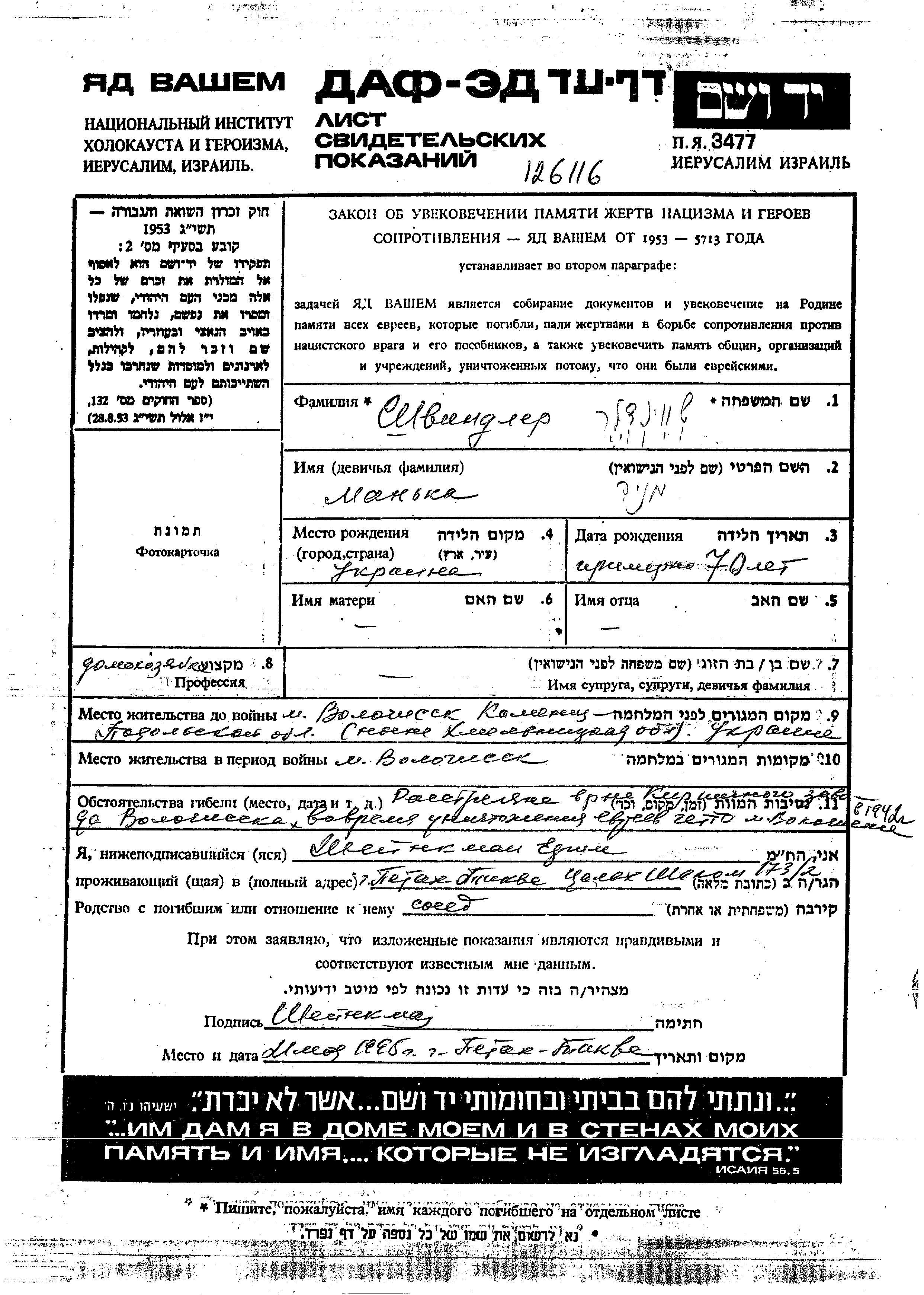 Швиндлер Манька Мина 1872 Волочиск, Украина (СССР) Лист свидетельских показаний