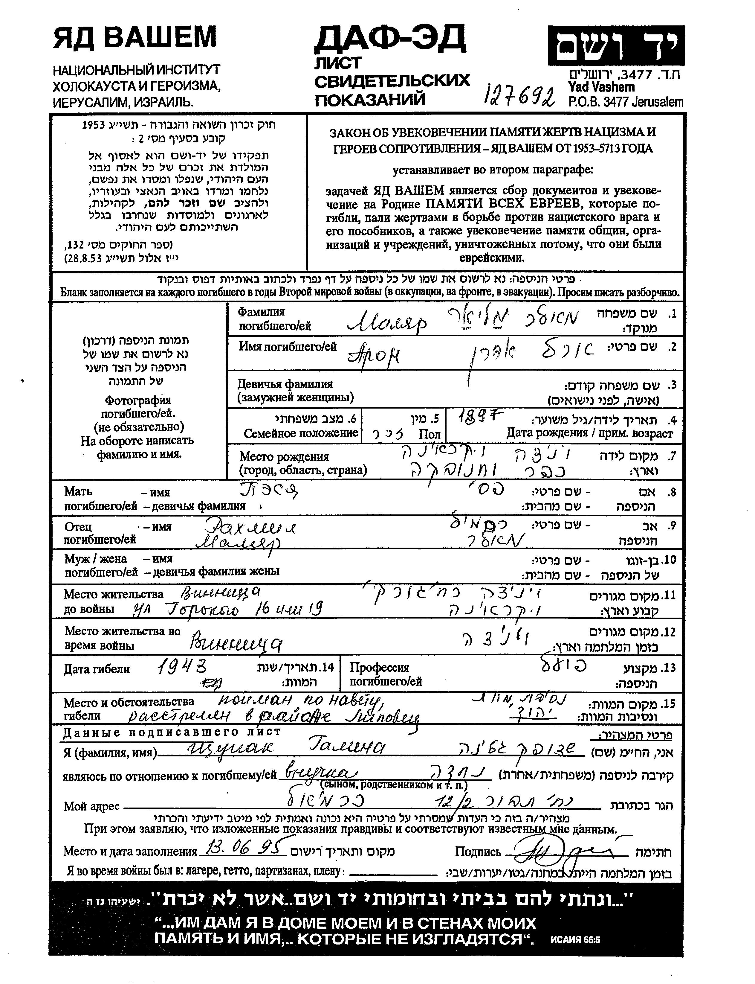 Маляр Арон 1897 Винница, Украина (СССР) Лист свидетельских показаний