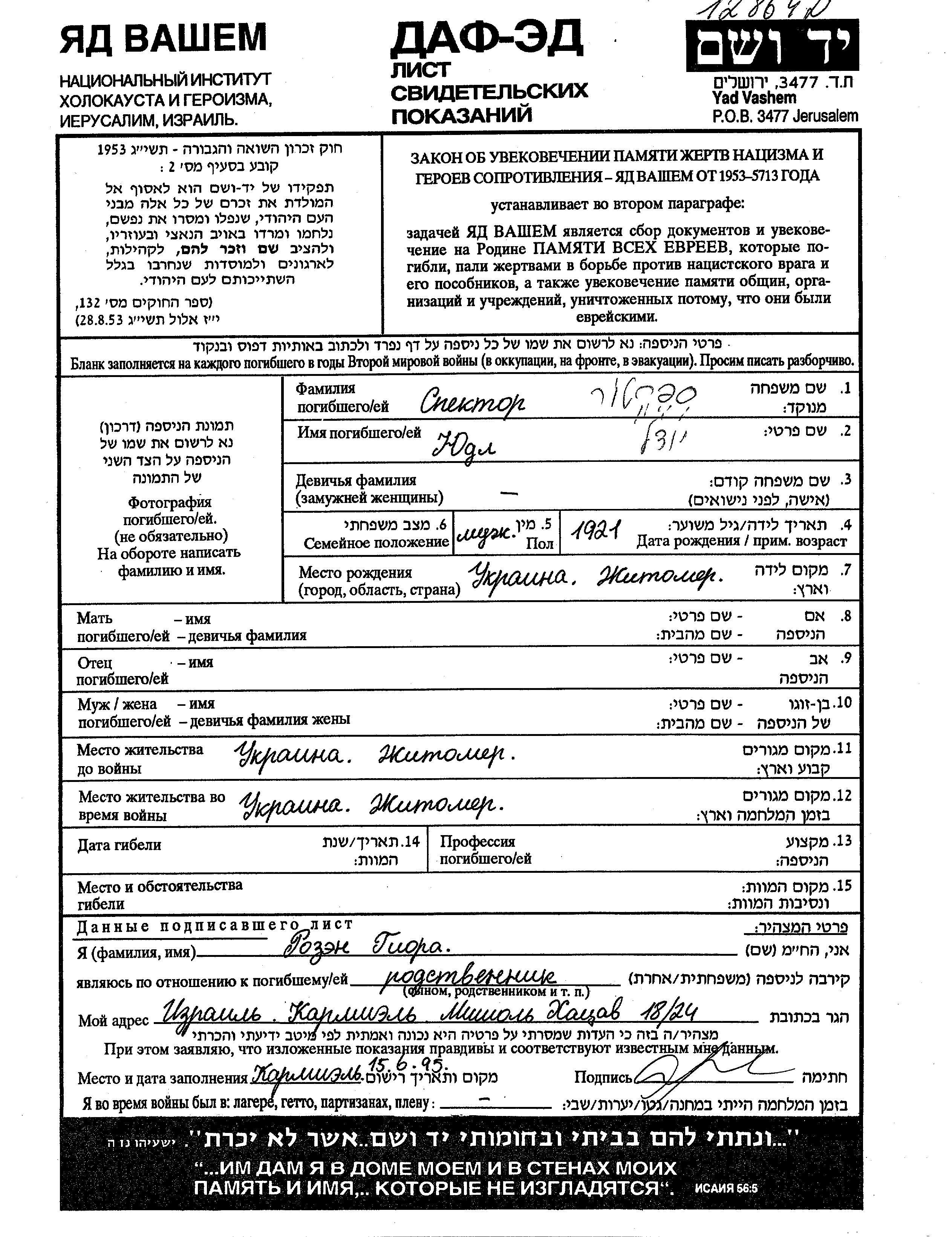 Спектор Юдл 1921 Житомир, Украина (СССР) Лист свидетельских показаний