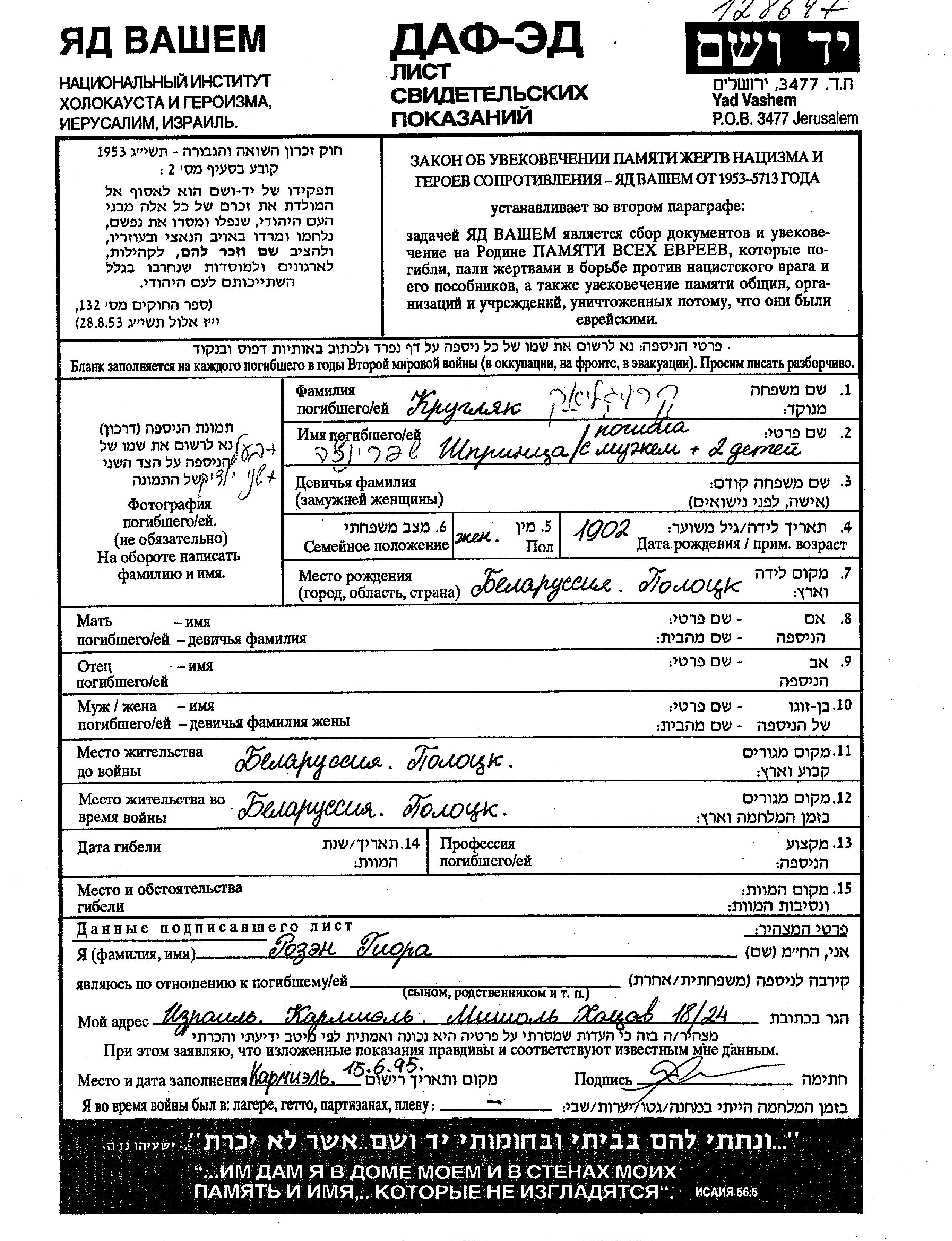 Шпринца Кругляк, место рождения: Полоцк, Белоруссия (СССР). Место жительства до войны: Полоцк, Белоруссия (СССР). Место во время войны: Полоцк, Белоруссия (СССР).