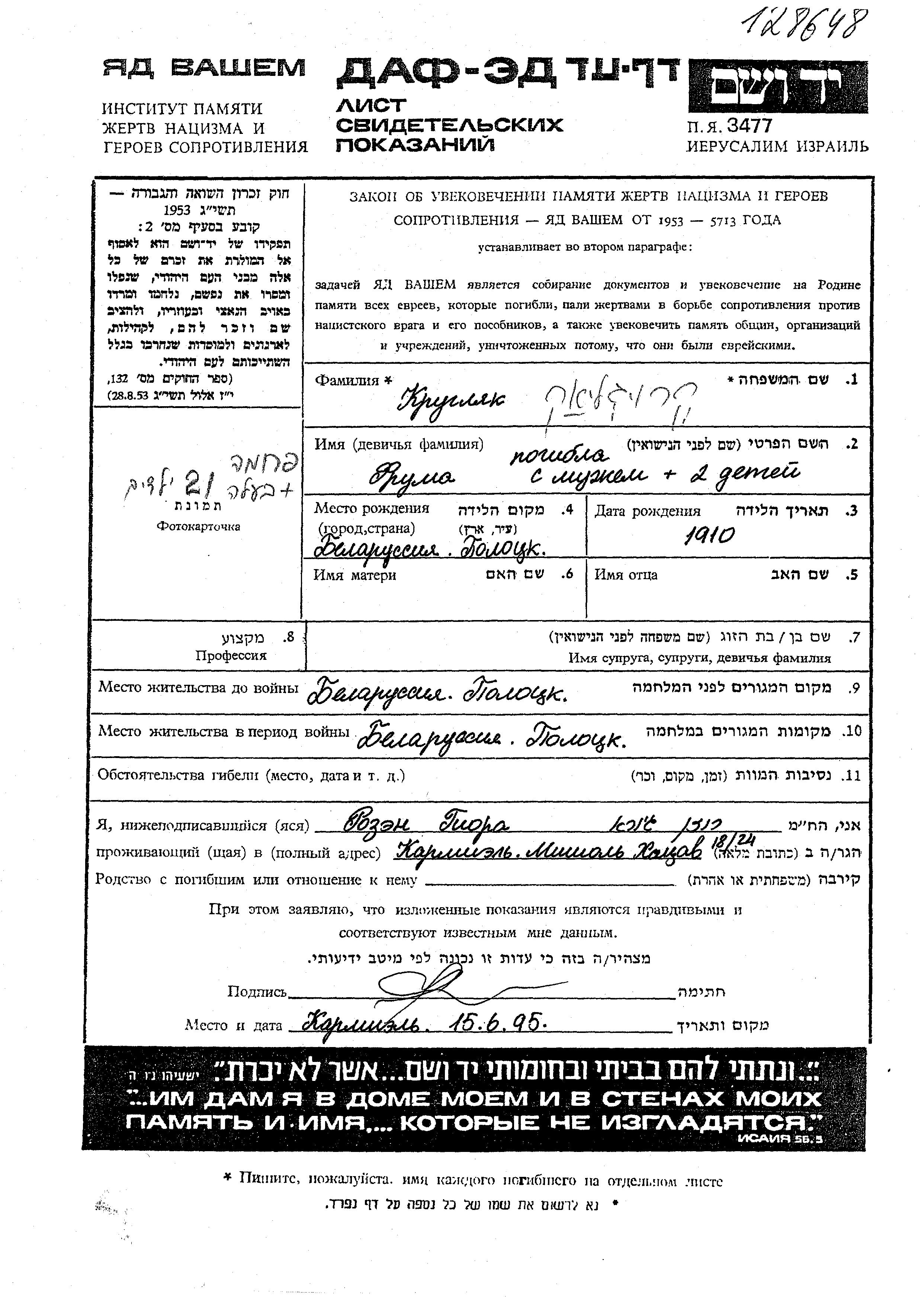 Кругляк Фрума 1910 Полоцк, Белоруссия (СССР) Лист свидетельских показаний