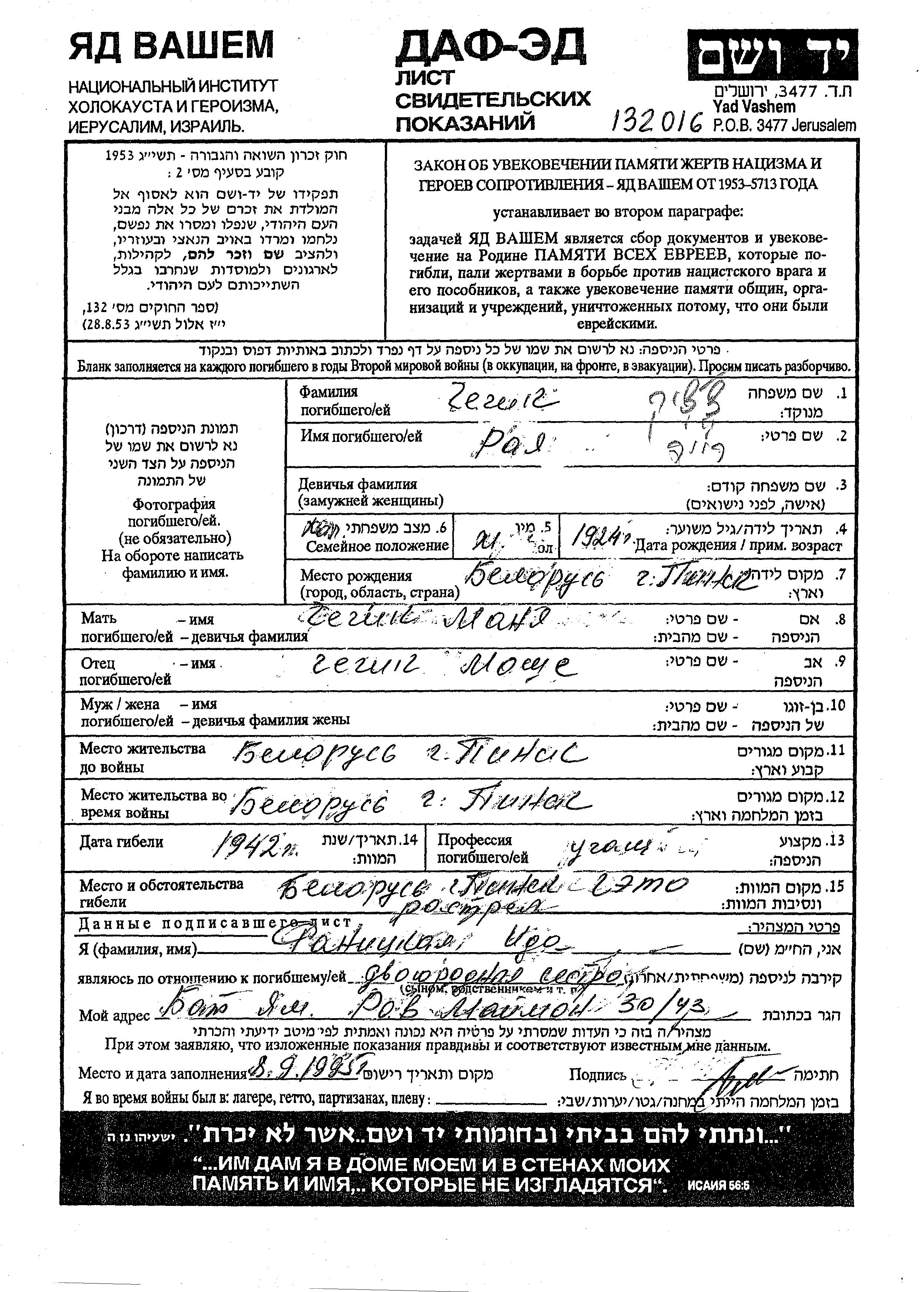 Яд Вашем - Листы свидетельских показаний Мемориального фонда