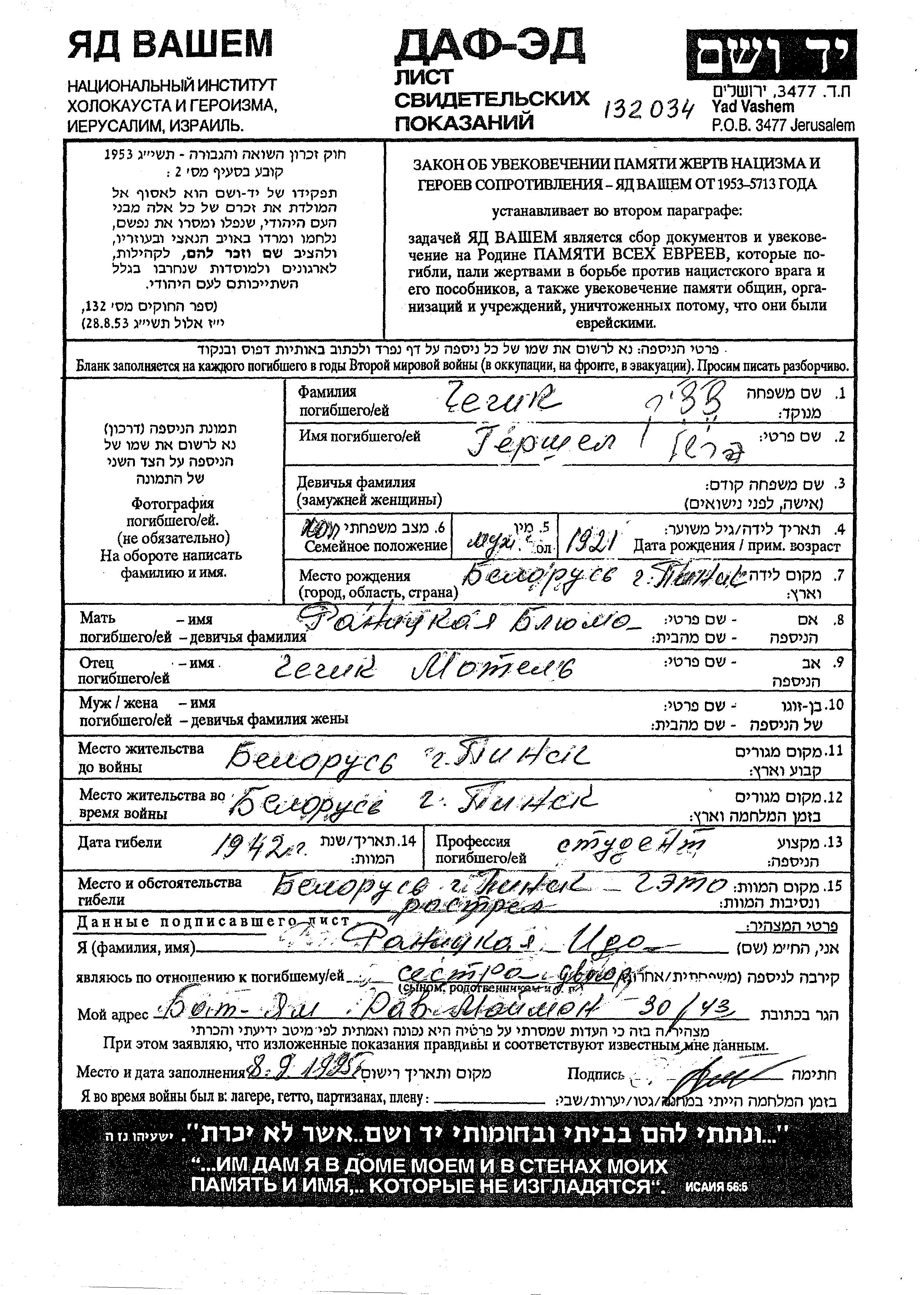 Яд Вашем - Листы свидетельских показаний Мемориального фонда