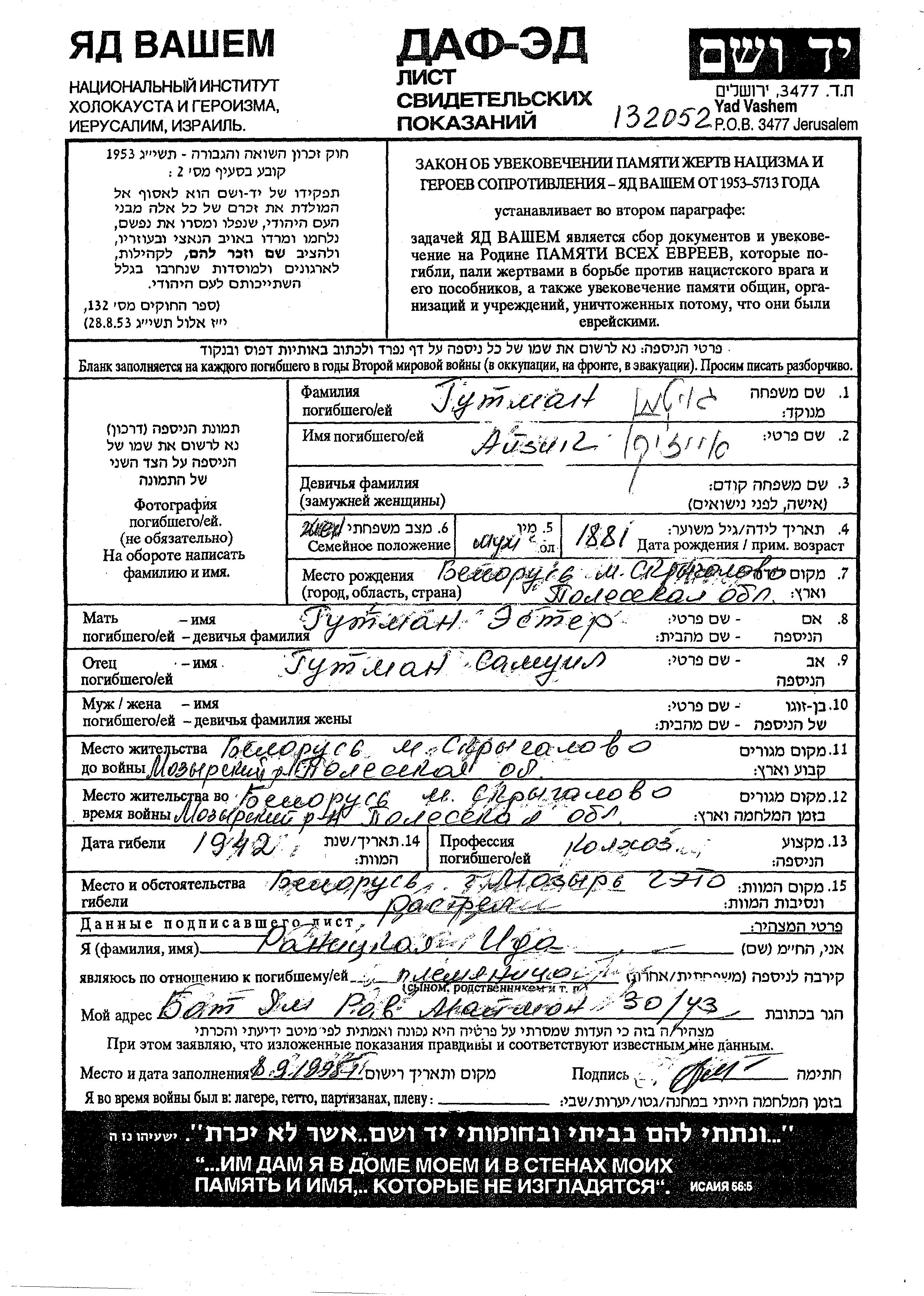 Гутман Айзик 1881 Скрыгалово, Белоруссия (СССР) Лист свидетельских показаний