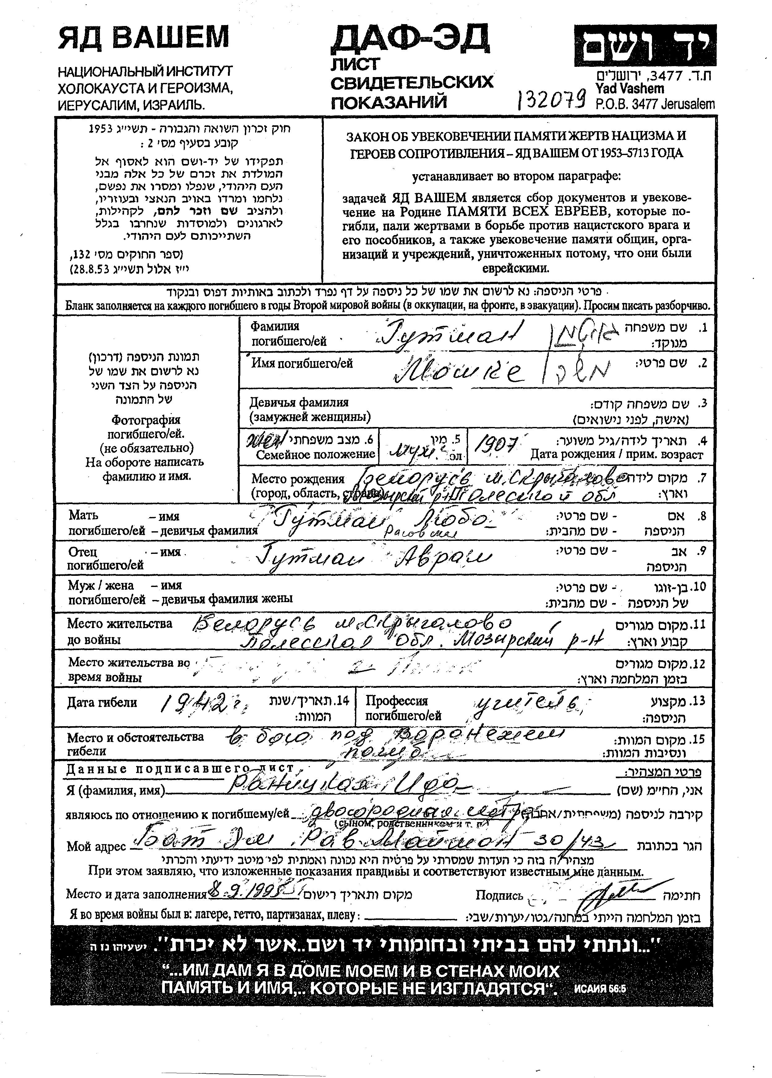 Мошке Мушке Гутман, место рождения: Скрыгалово, Белоруссия (СССР). Отец: Аврам, mать:Люба, девичья фамилия Расовский. Учитель / учительница. Женат / замужем. Место жительства до войны: Скрыгалово, Белоруссия (СССР). Место во время войны: Вооруженные силы Советского Союза. Мошке Мушке погиб на военной службе. место смерти: Воронеж, Россия (СССР) в 1942.