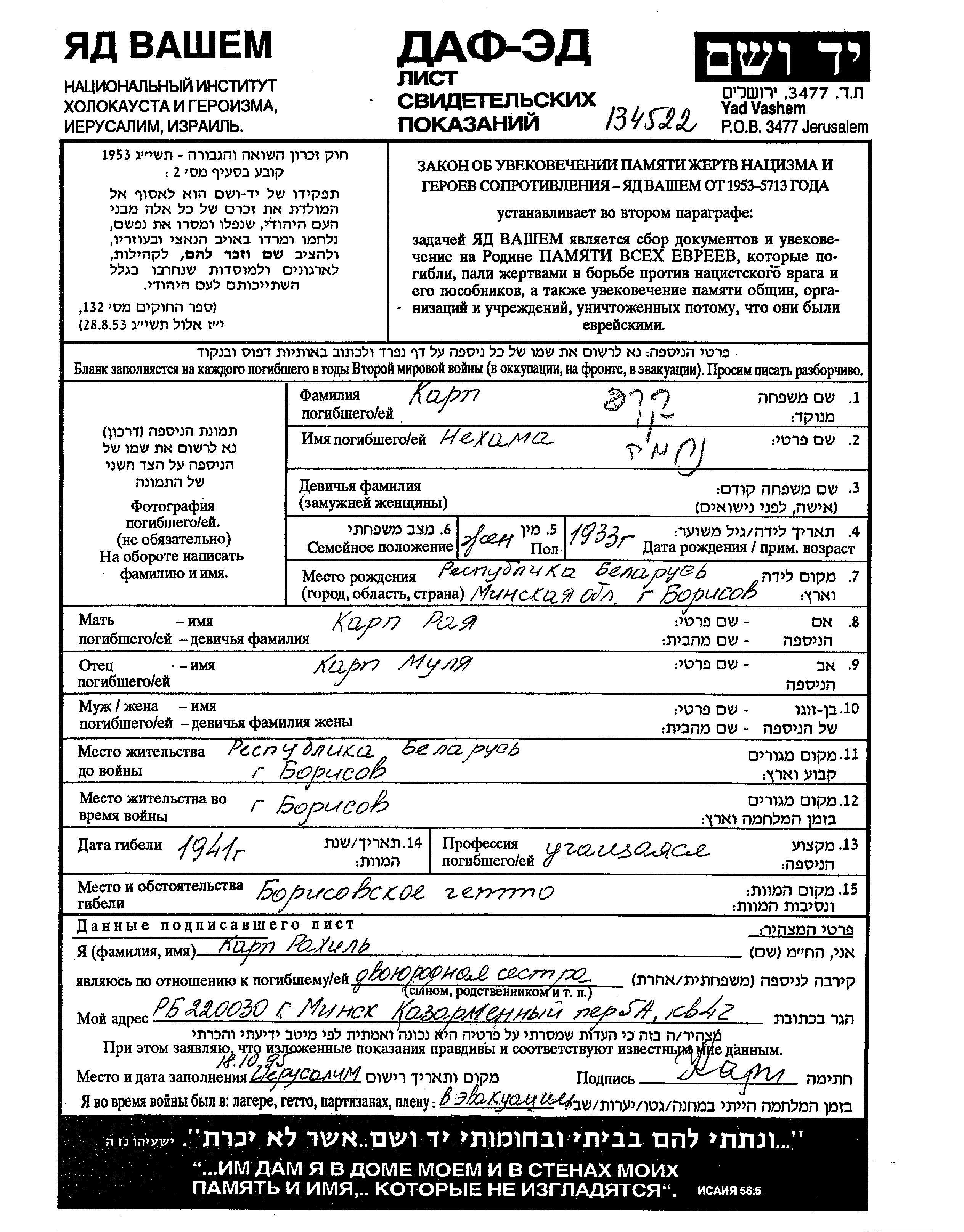 Карп Нехама 1933 Борисов, Белоруссия (СССР) Лист свидетельских показаний