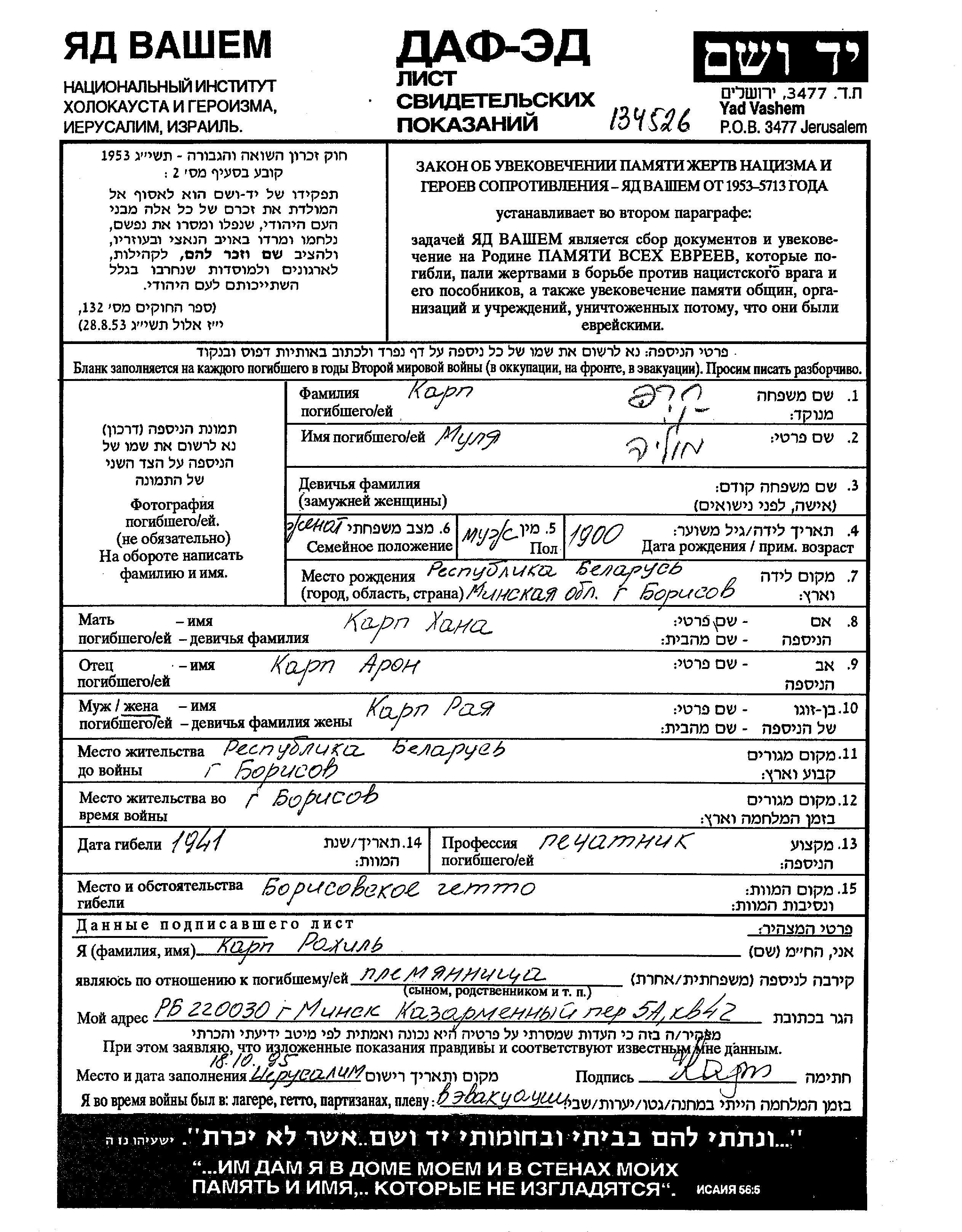 Муля Карп, место рождения: Борисов, Белоруссия (СССР). Отец: Арон, mать:Хана. Наборщик/ца. Женат / замужем. Место жительства до войны: Борисов, Белоруссия (СССР). Место во время войны: Борисов, Белоруссия (СССР).