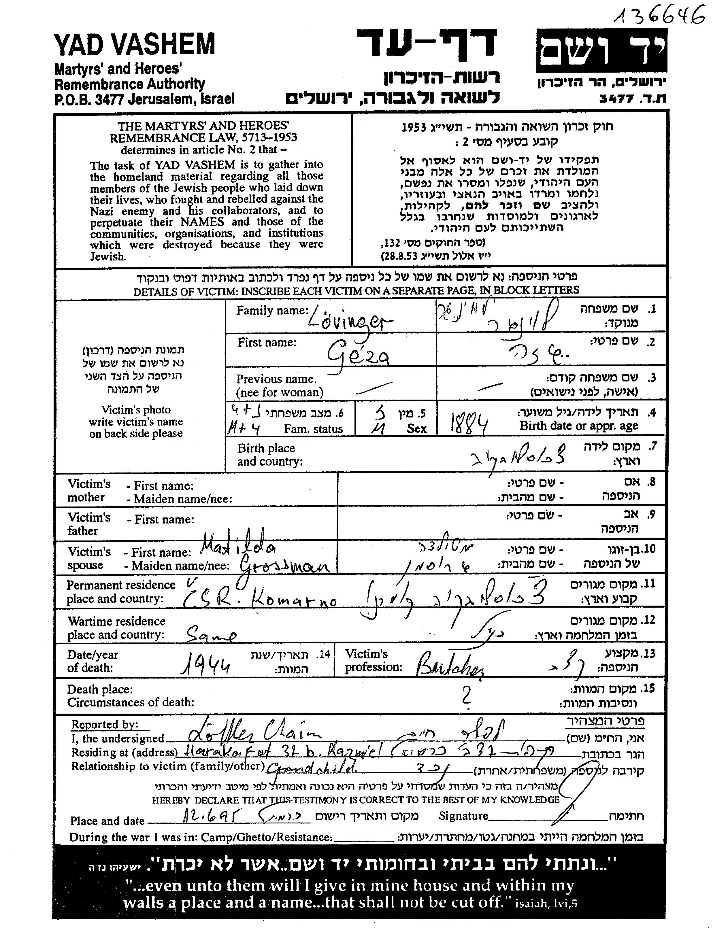 Геза Лёвингер, место рождения: Чехословакия. Мясник. Женат / замужем. Место жительства до войны: Комарно, Чехословакия. Место во время войны: Комарно, Чехословакия.
