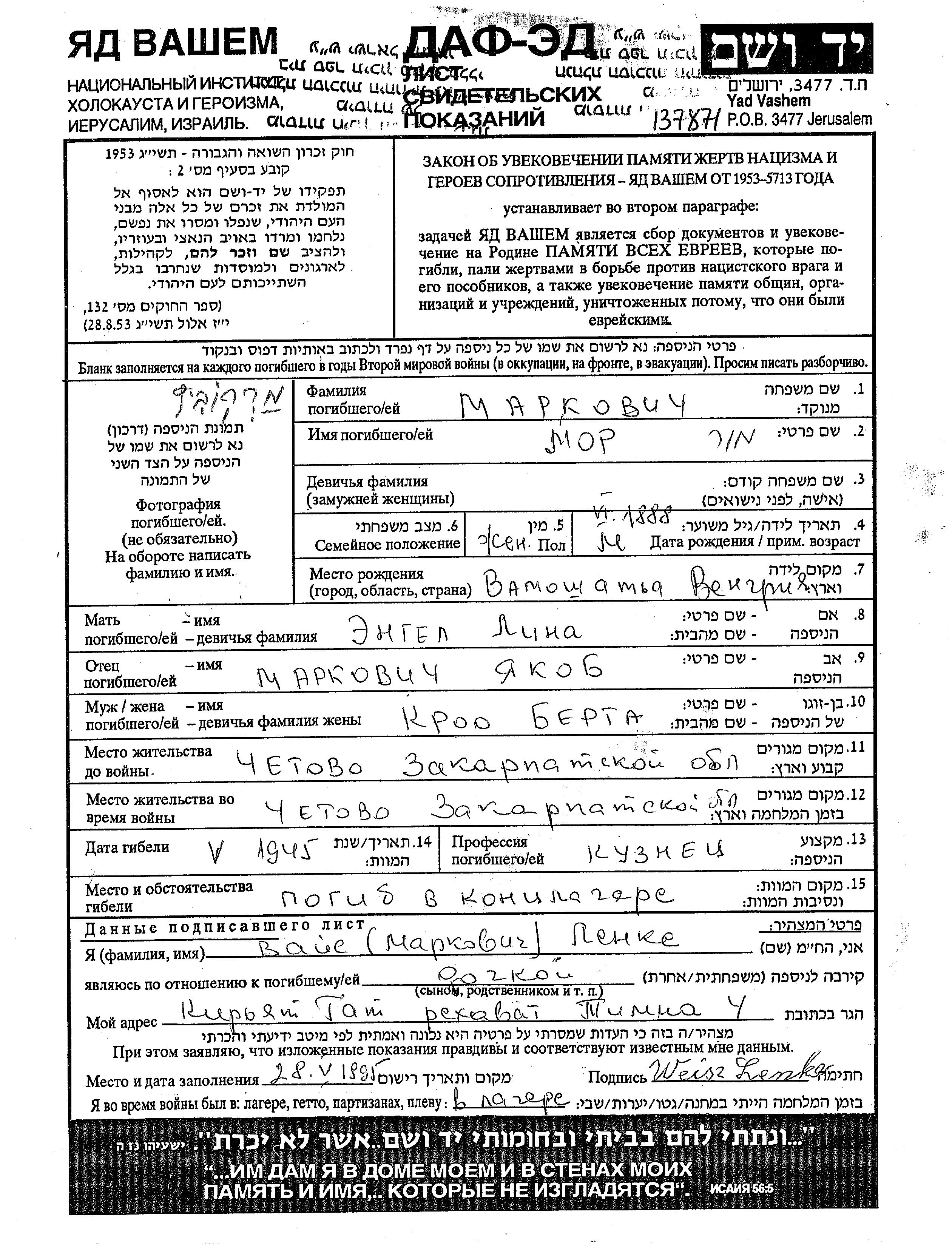 Яд Вашем - Листы свидетельских показаний Мемориального фонда
