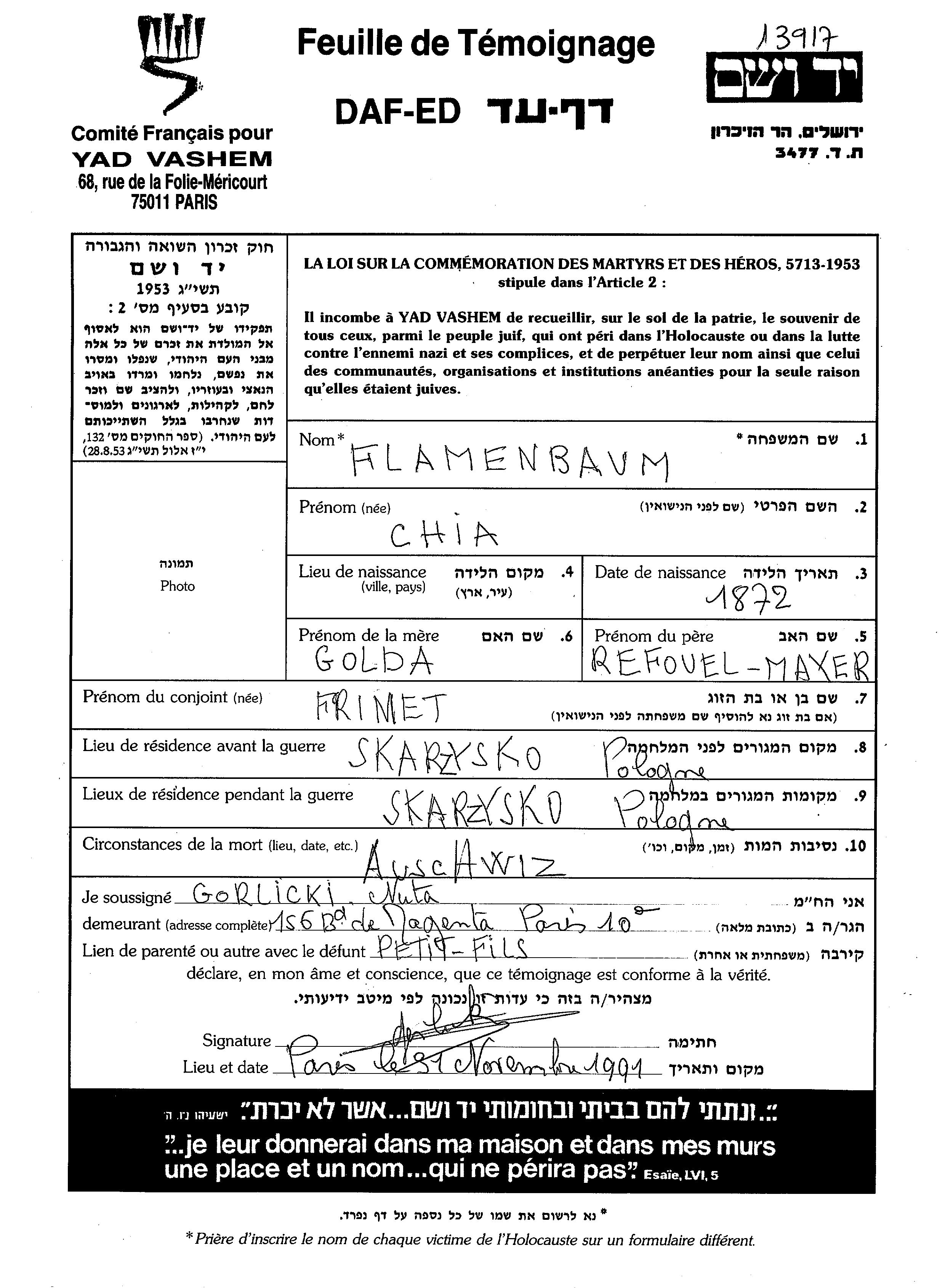 Хия Шие Фламенбаум. Отец: Рафаэль Майер, mать:Голда. Женат / замужем. Место жительства до войны: Скаржиско-Каменна, Польша. Место во время войны: Скаржиско-Каменна, Польша.