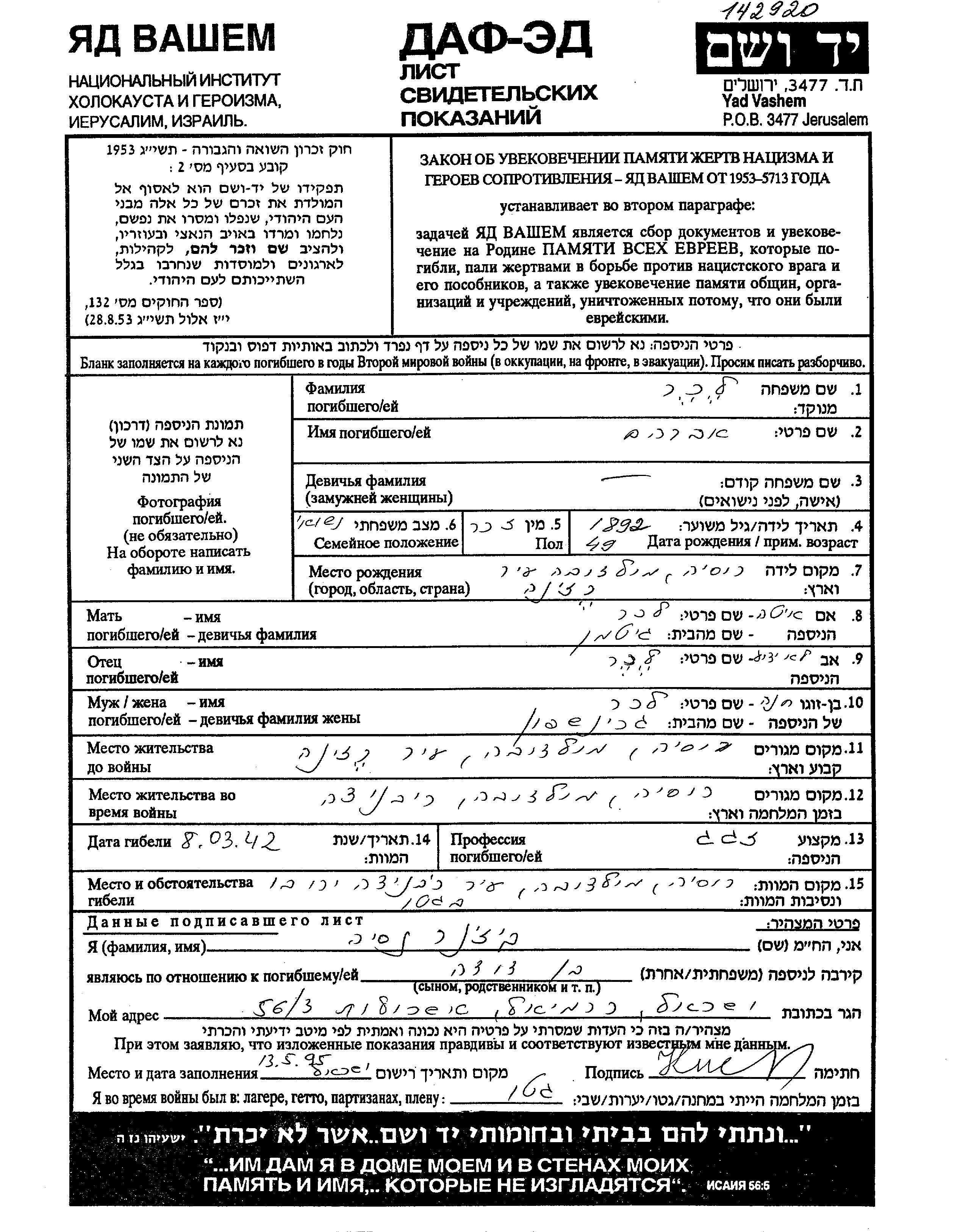 Яд Вашем - Листы свидетельских показаний Мемориального фонда