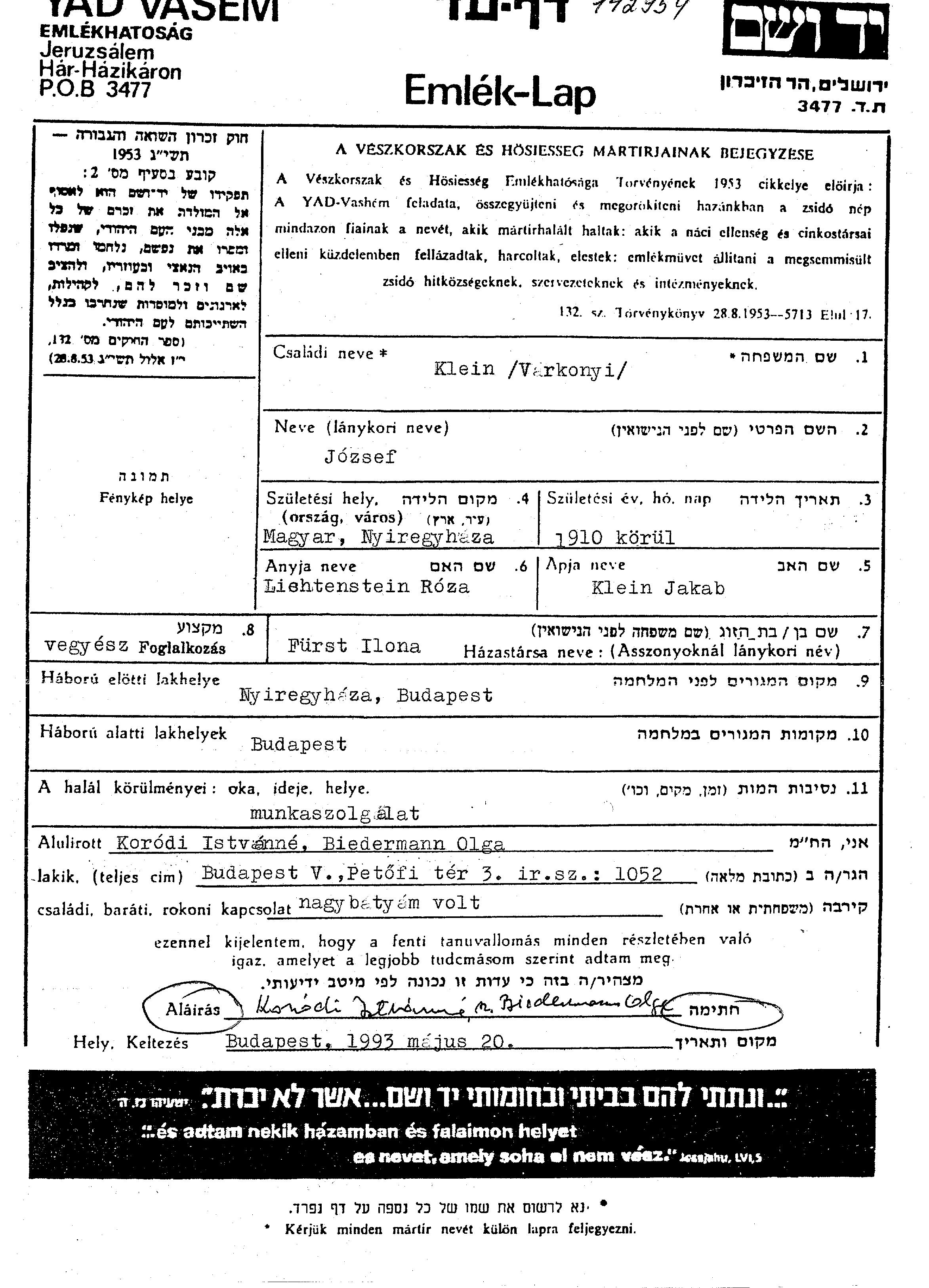 Йозеф Варконьи Клейн, место рождения: Ньиредьхаза, Венгрия. Отец: Якаб, mать:Роза, девичья фамилия Лихтенштайн. Химик. Женат / замужем. Место жительства до войны: Ньиредьхаза, Венгрия. Место во время войны: Будапешт, Венгрия.