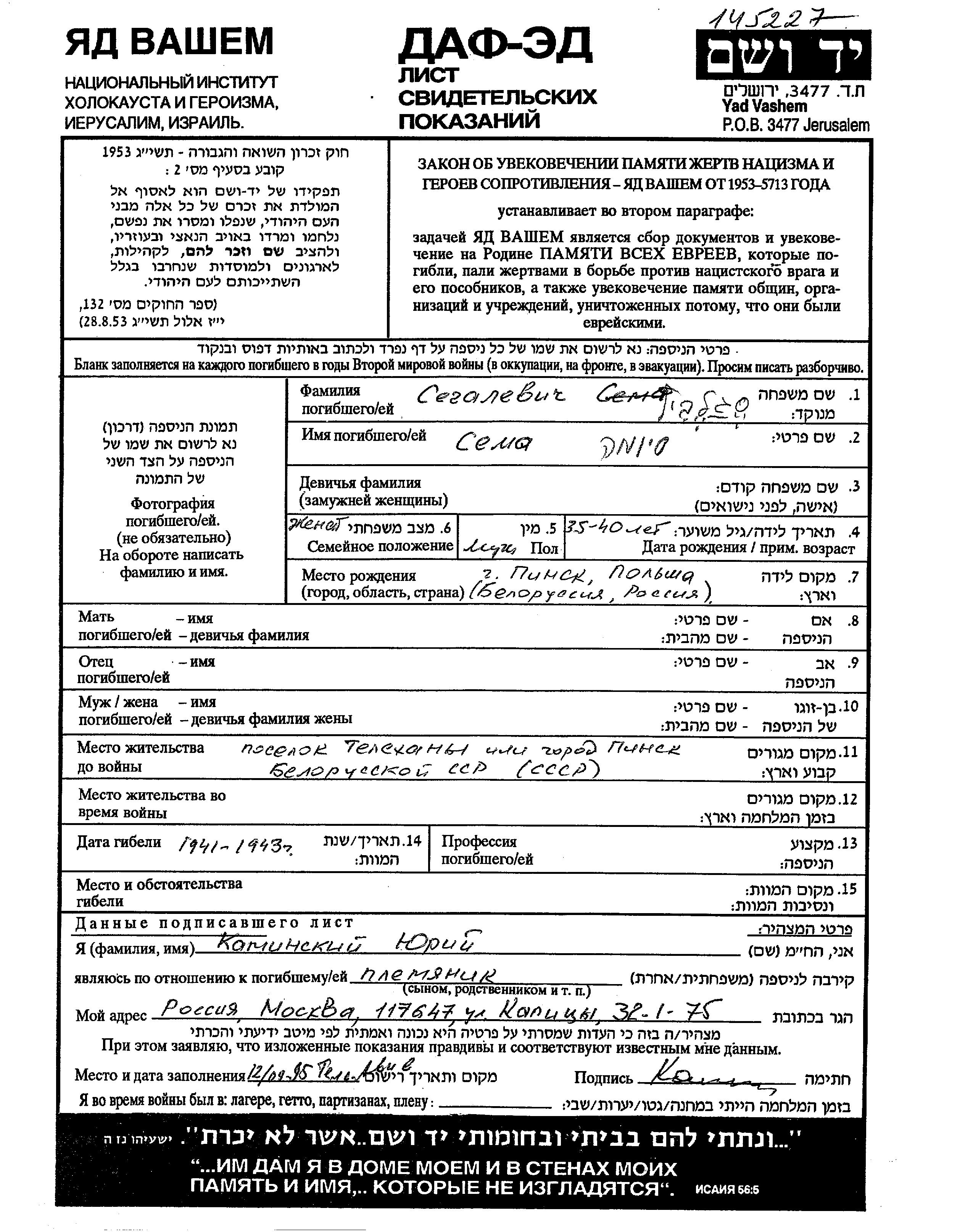 Сёма Сегалевич, место рождения: Пинск, Польша. Женат / замужем. Место жительства до войны: Пинск, Польша.