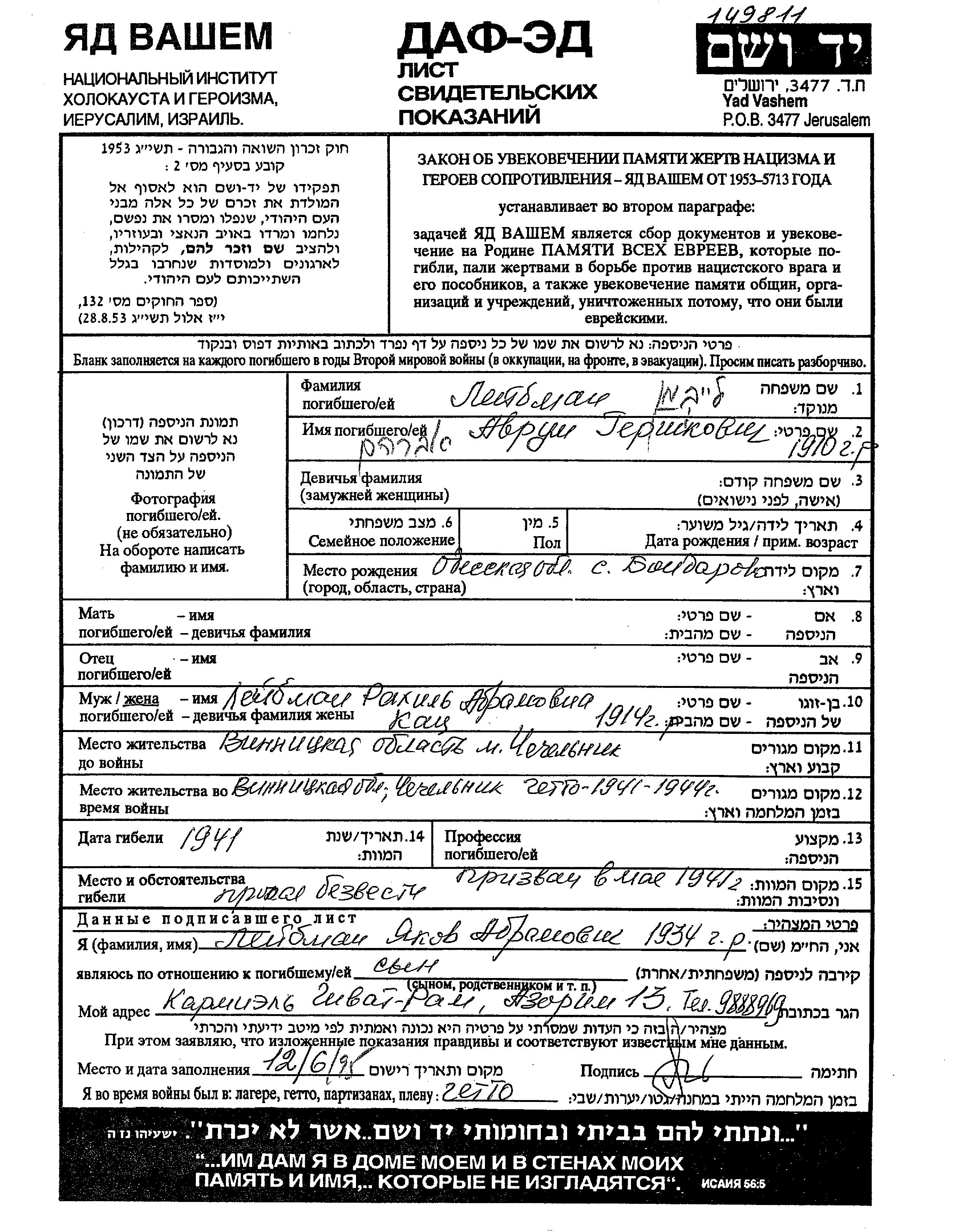 Яд Вашем - Листы свидетельских показаний Мемориального фонда