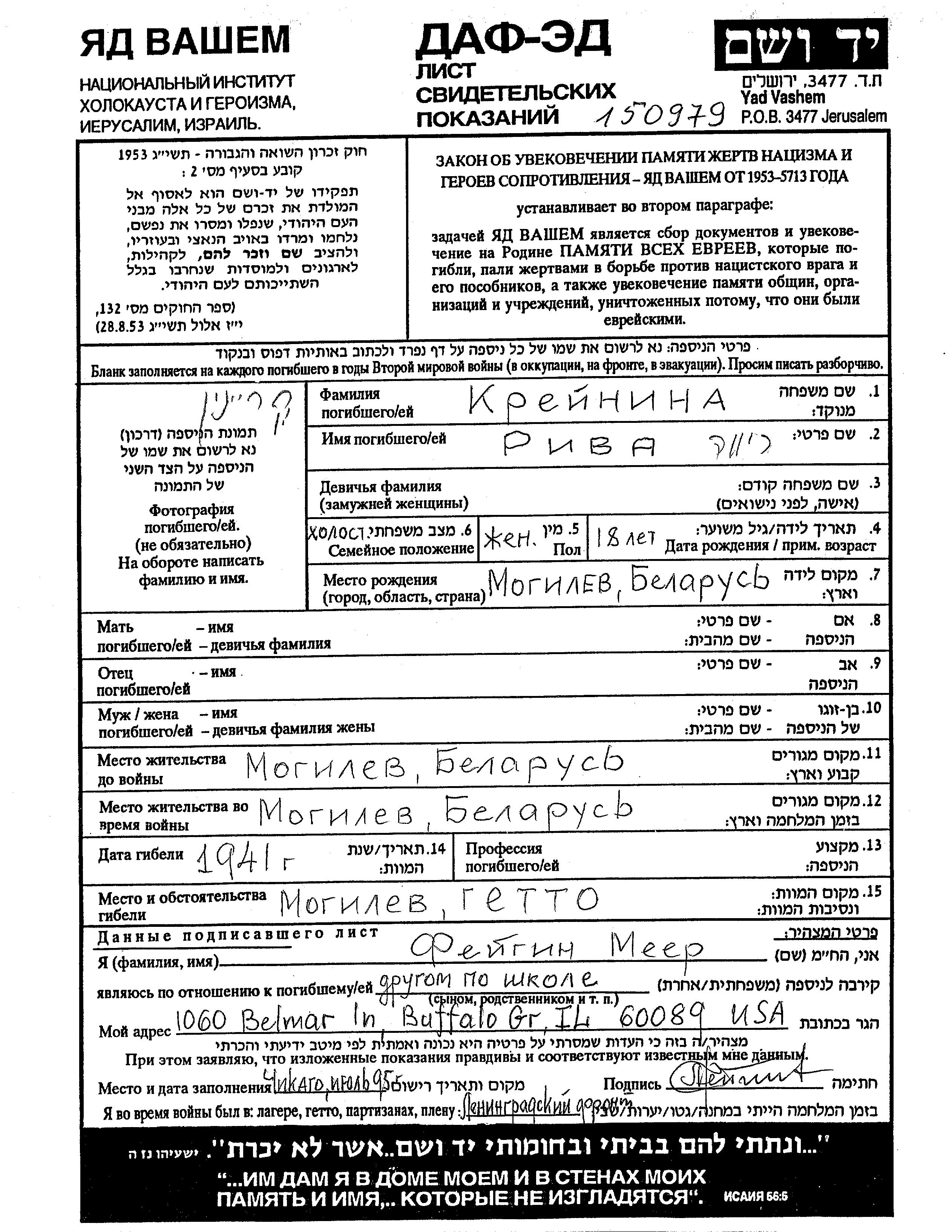 Крейнин Рива 1923 Могилёв, Белоруссия (СССР) Лист свидетельских показаний