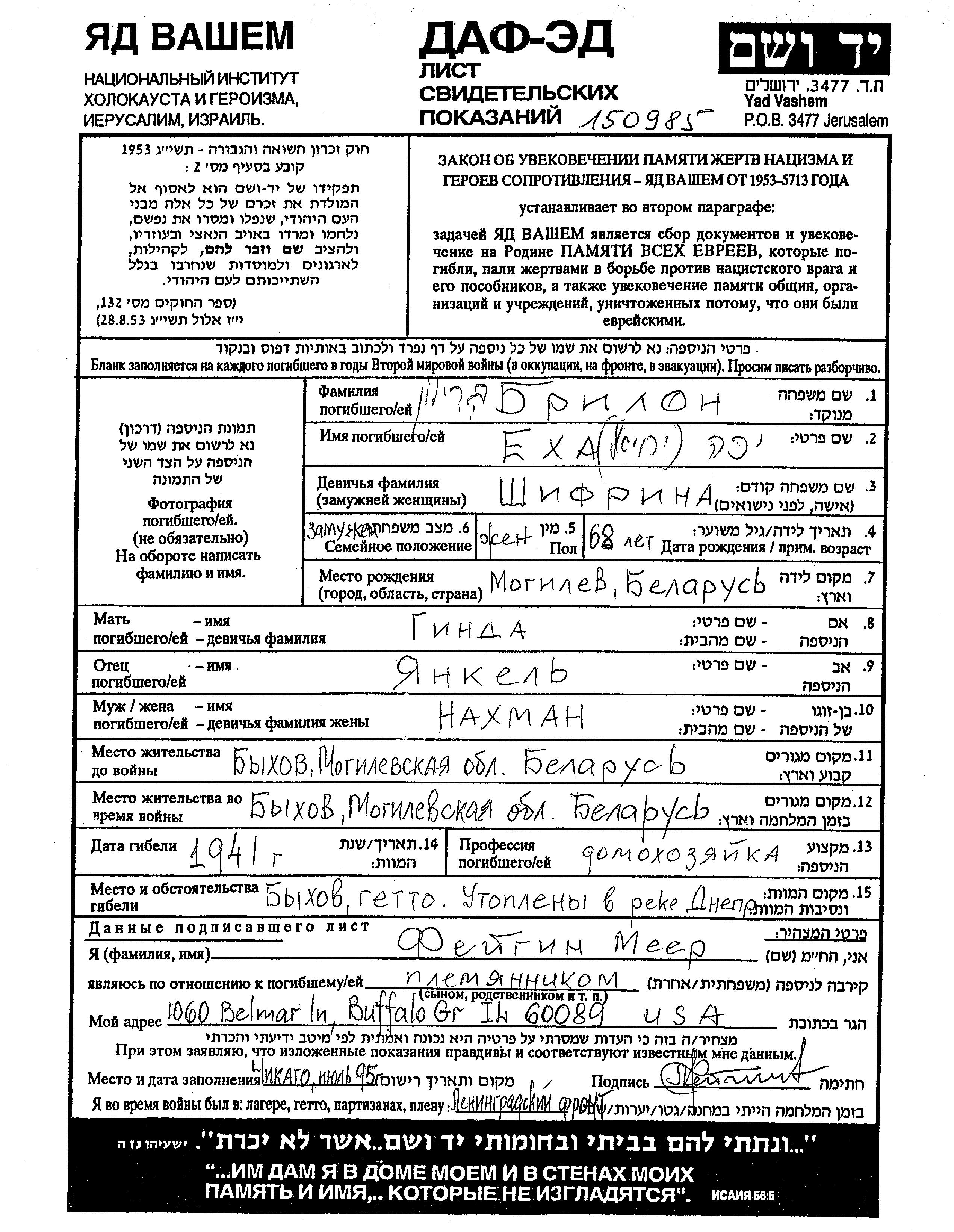 Яд Вашем - Листы свидетельских показаний Мемориального фонда
