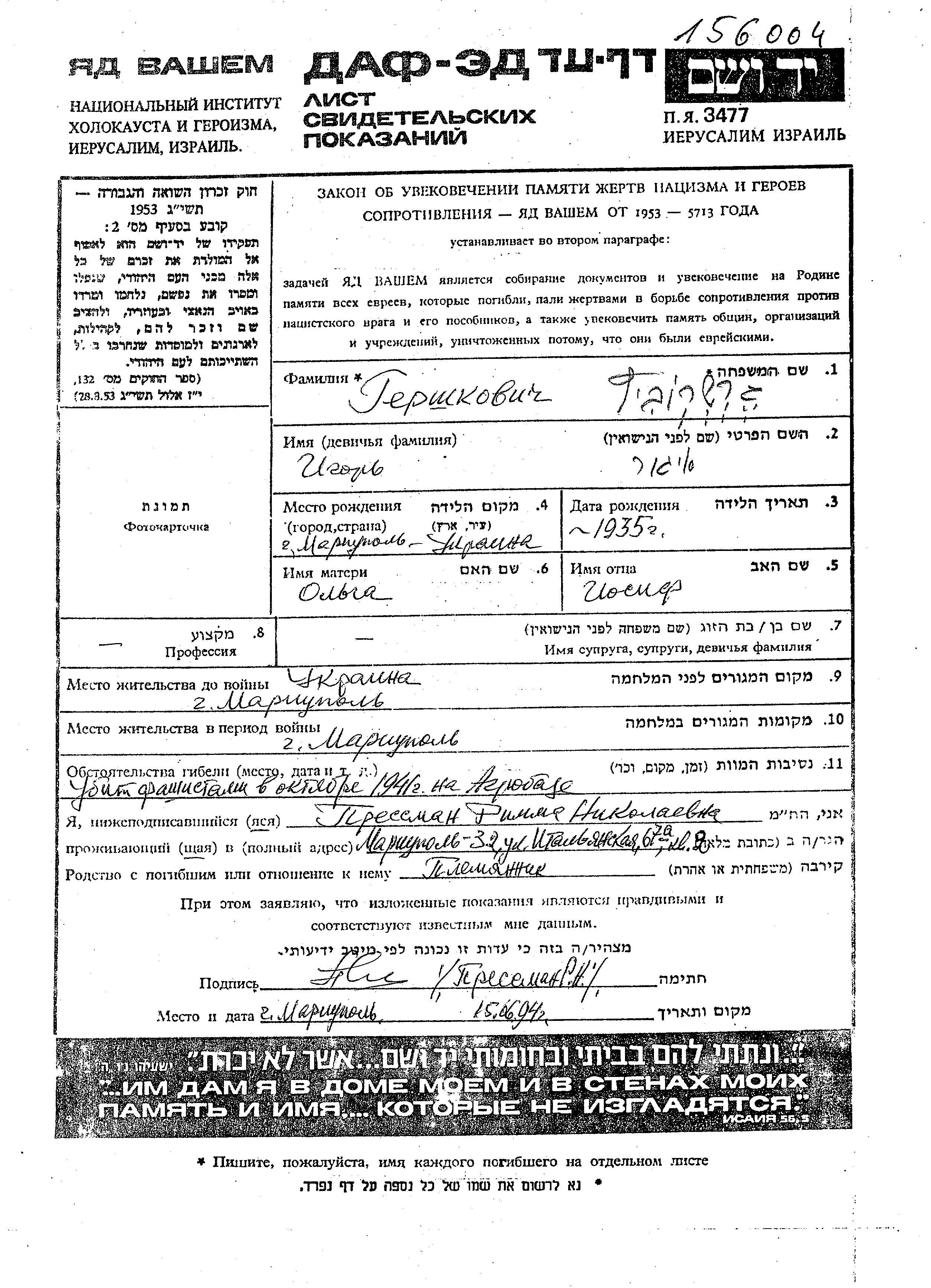 Гершкович Игорь 1935 Мариуполь, Украина (СССР) Лист свидетельских показаний