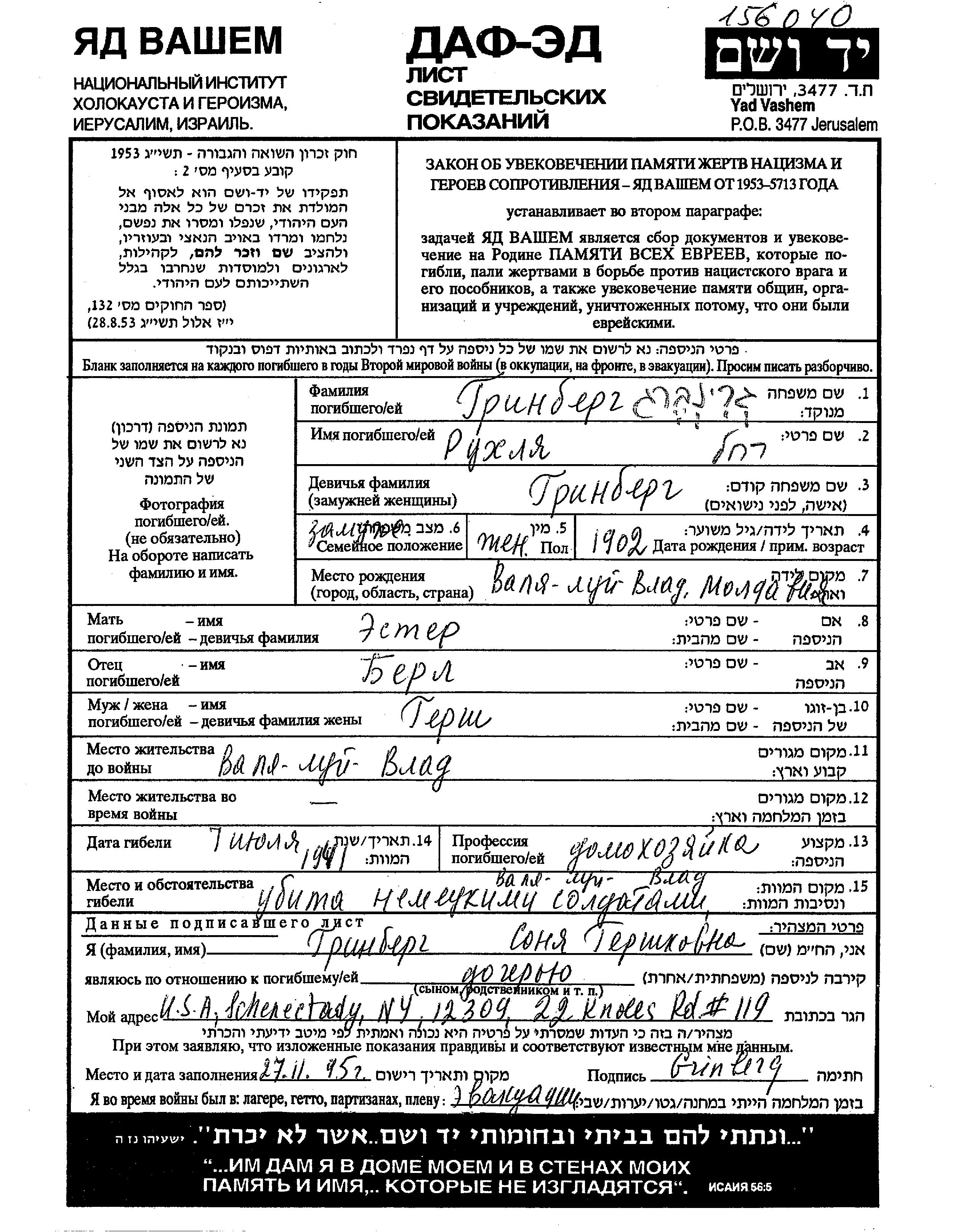 Яд Вашем - Листы свидетельских показаний Мемориального фонда