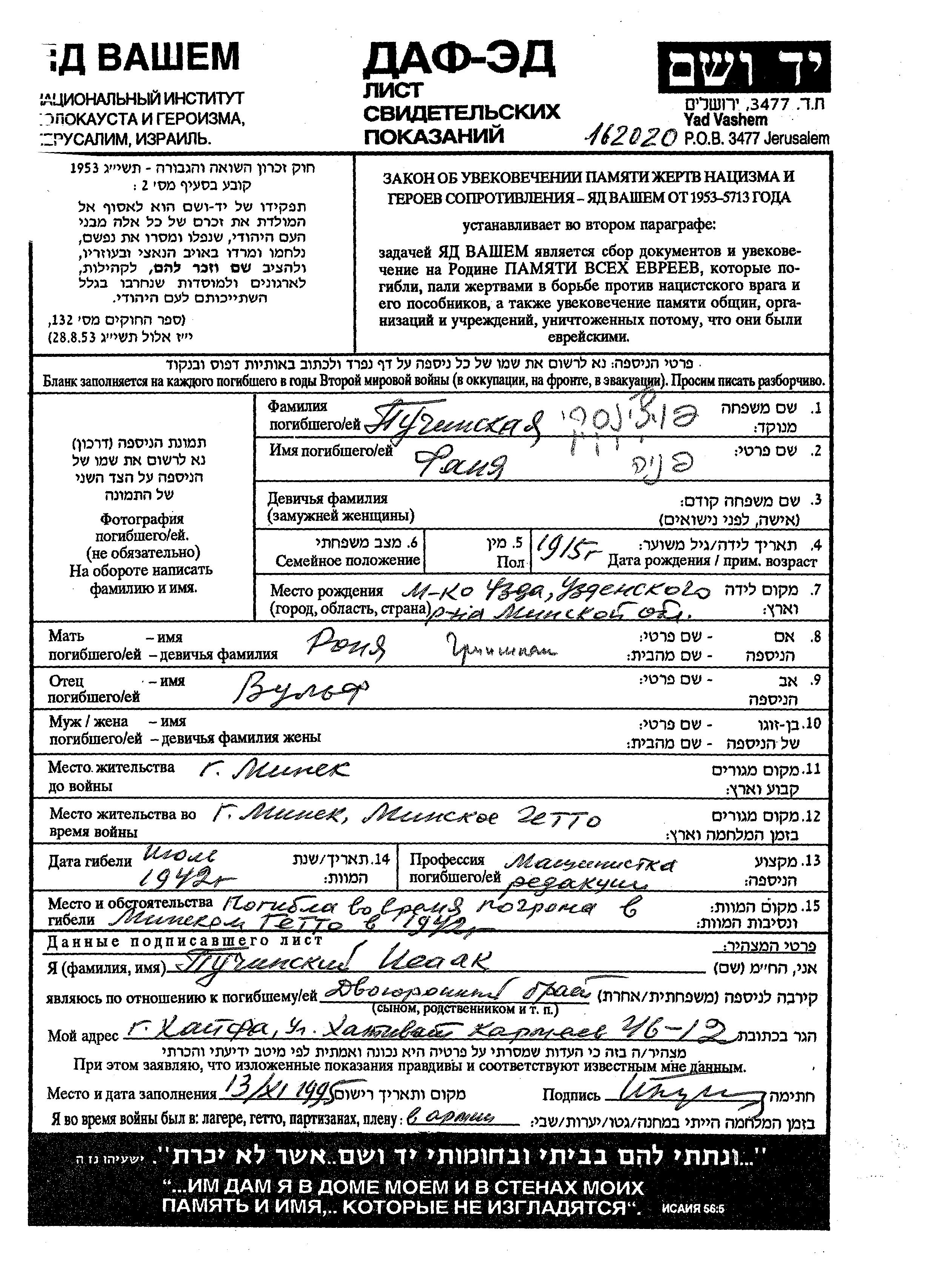 Пучински Фаня 1915 Минск, Белоруссия (СССР) Лист свидетельских показаний