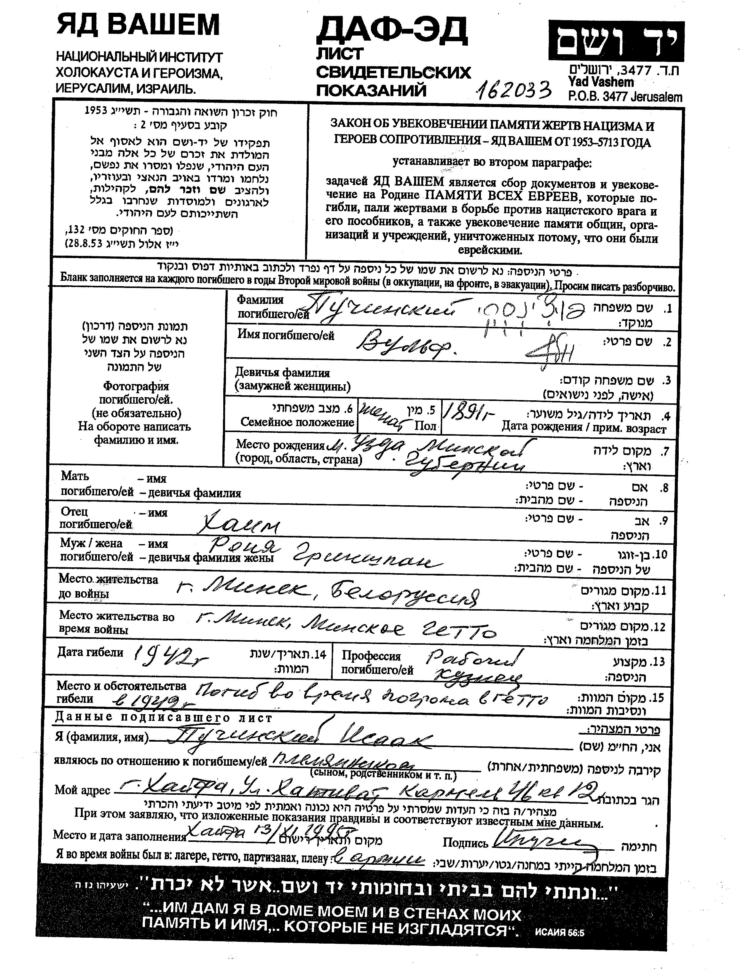 Вульф Пучински, место рождения: Узда, Белоруссия (СССР). Отец: Хаим. Кузнец. Женат / замужем. Место жительства до войны: Минск, Белоруссия (СССР). Место во время войны: Минск, Белоруссия (СССР).
