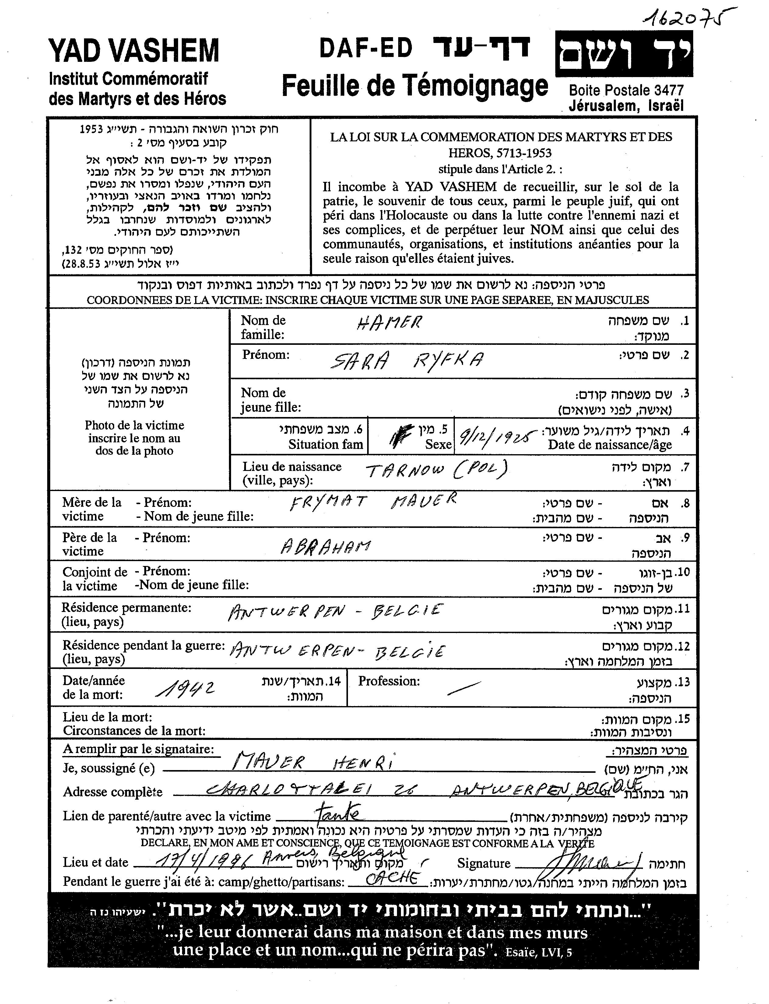 Хамер Рыфка Сара 1925 Антверпен, Бельгия Лист свидетельских показаний
